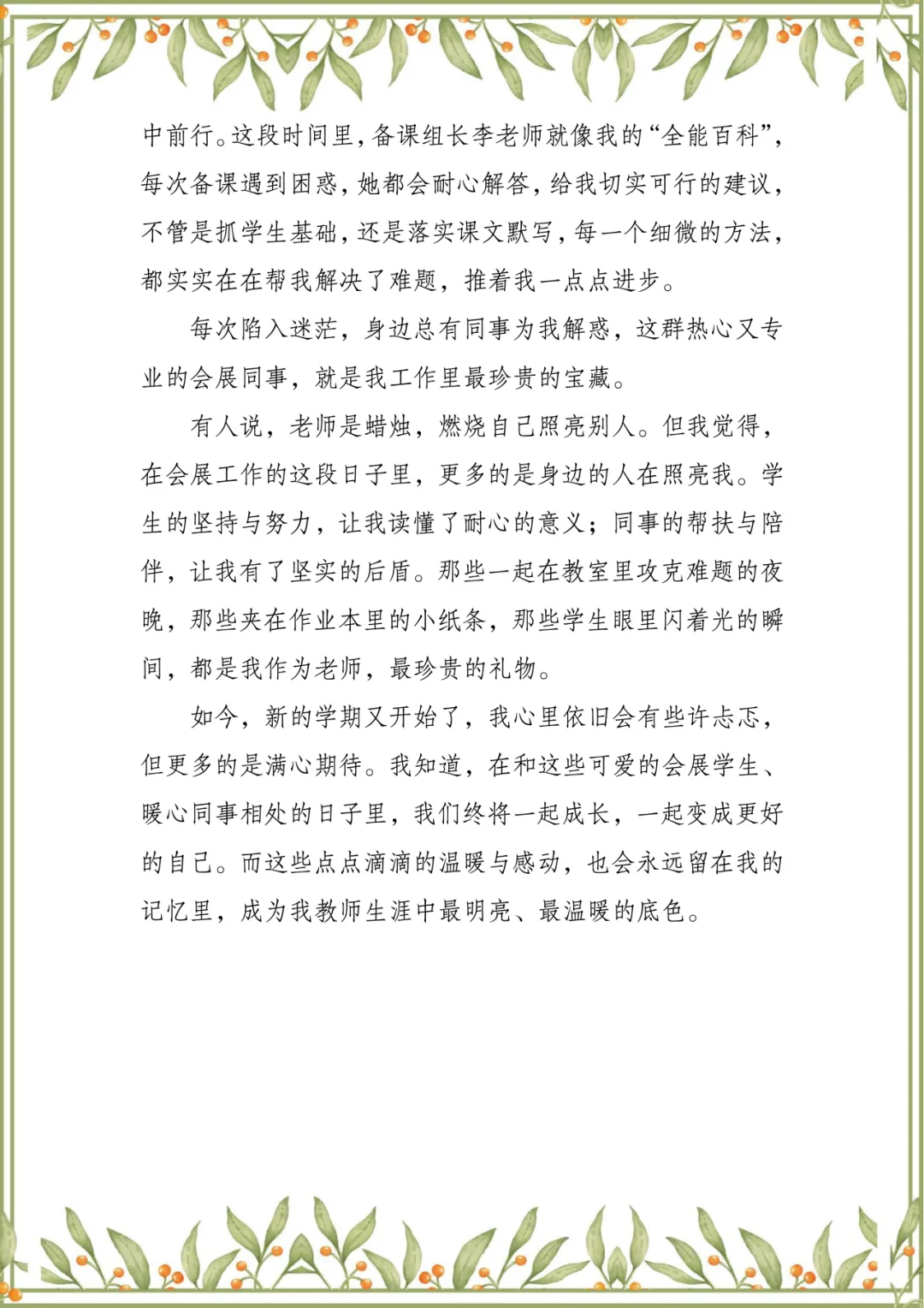 在会展学校工作满一年之际,一张学生手绘的教师节卡片,让周彩琳老师蓦然回首那些细碎而温暖的时光。曾有一位英语零基础的女孩,用工整的作业引起她的注意,她在鼓励与关注中默默陪伴,见证了那本写满注释的课本和越来越多红勾的默写本,最终收获了一封满纸真诚的感谢信,也读懂了教育的真谛在于共同成长。面对教学迷茫,她在师父和备课组长的倾囊相授中找到了方向,那些实用的方法与耐心地解答,成为她站稳讲台的底气。