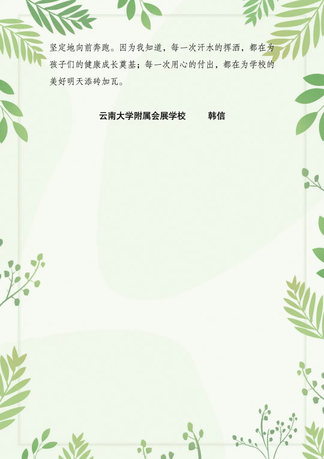 来到会展学校刚满一年,韩信老师在适应中不断成长。初来时,她虚心向同事请教,把“节奏慢跑”带进课堂;她与内向的小杰约定每日加练篮球,用陪伴点燃了孩子的自信。备战区基本功大赛,她在前辈指导下反复打磨;那次失败的公开课,让她学会了反思,更懂得“以学生为中心”。她还帮助焦虑的小林用“分段跑”突破自己,收获了作为体育老师独有的幸福。在温暖的体育组里,大家共同筹备运动会,彼此支撑。这一年,她在这片沃土上努力扎根,未来,她将继续与会展一起,坚定地向前奔跑。
