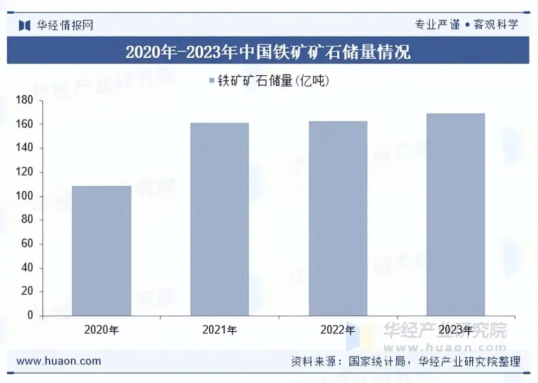 铁矿矿石是高锰钢生产的核心原材料之一。高锰钢的生产依赖于铁矿石中的铁元素,通过冶炼过程将铁矿石转化为生铁,再进一步加工成高锰钢,因此,铁矿矿石的稳定供应对高锰钢行业的生产运营至关重要。截至2023年底,中国铁矿矿石储量为169.2亿吨。