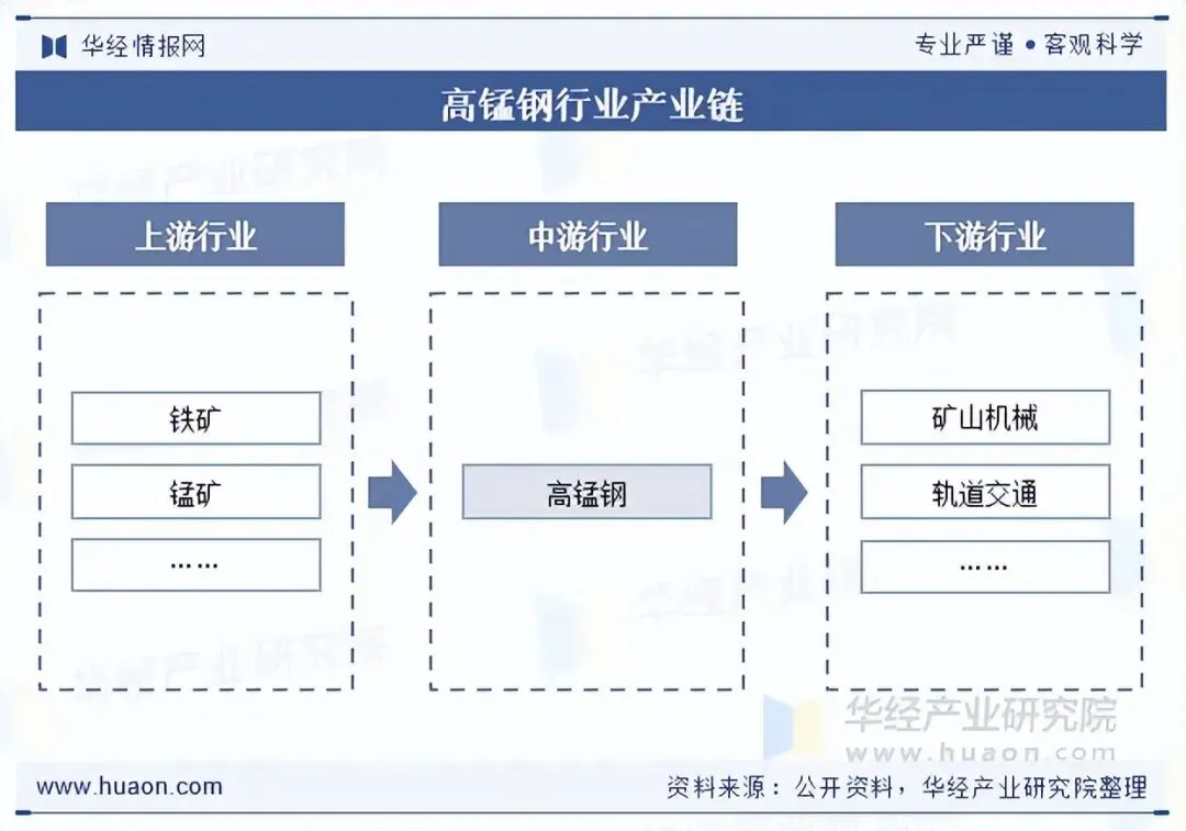 产业链方面,上游为原材料供应环节,涉及铁矿石、锰矿等核心原料,以及焦炭、耐火材料等能源和辅助材料;中游为高锰钢加工制造环节,涵盖了冶炼、铸造、热处理等流程;下游则是应用环节,主要包括矿山机械、工程机械、冶金、轨道交通等领域。