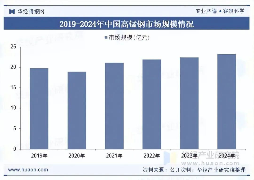 一方面,随着基础设施建设的不断推进,高锰钢在矿山机械、工程机械、轨道交通等领域的应用需求持续增长;另一方面,新能源重型装备、智能矿山建设等新兴领域兴起,为高锰钢开辟了新需求增长点,推动行业规模不断扩大。2024年,中国高锰钢市场规模约为23.3亿元。