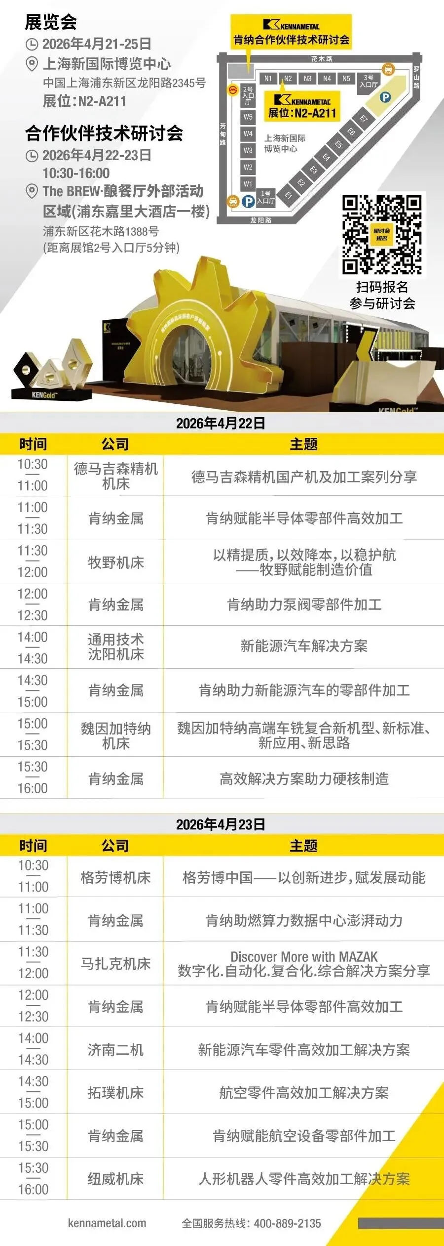 此外,肯纳金属还将于4月22日-23日,与机床商合作伙伴联合举办“聚力深耕,赋能具身制造”技术交流活动。内容涵盖最前沿领域的高端制造技术及解决方案,助您在高端制造领域抢占先机,实现新突破。