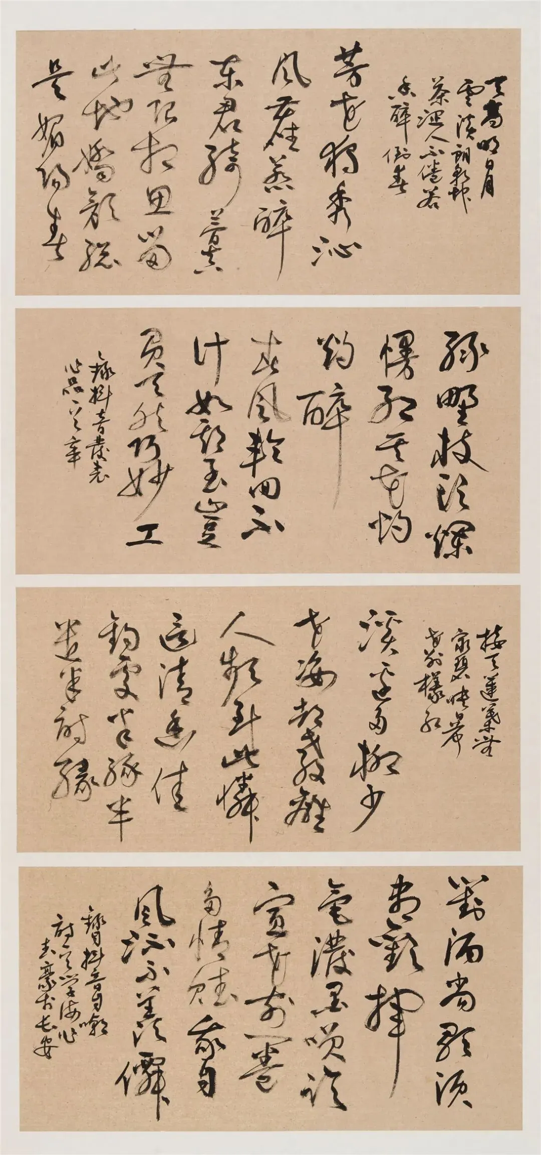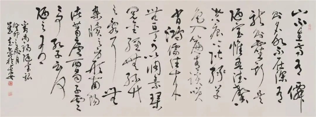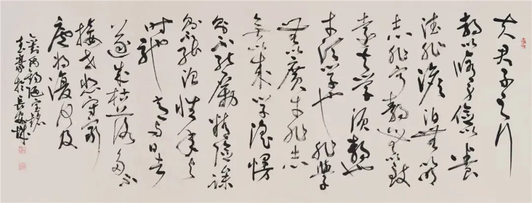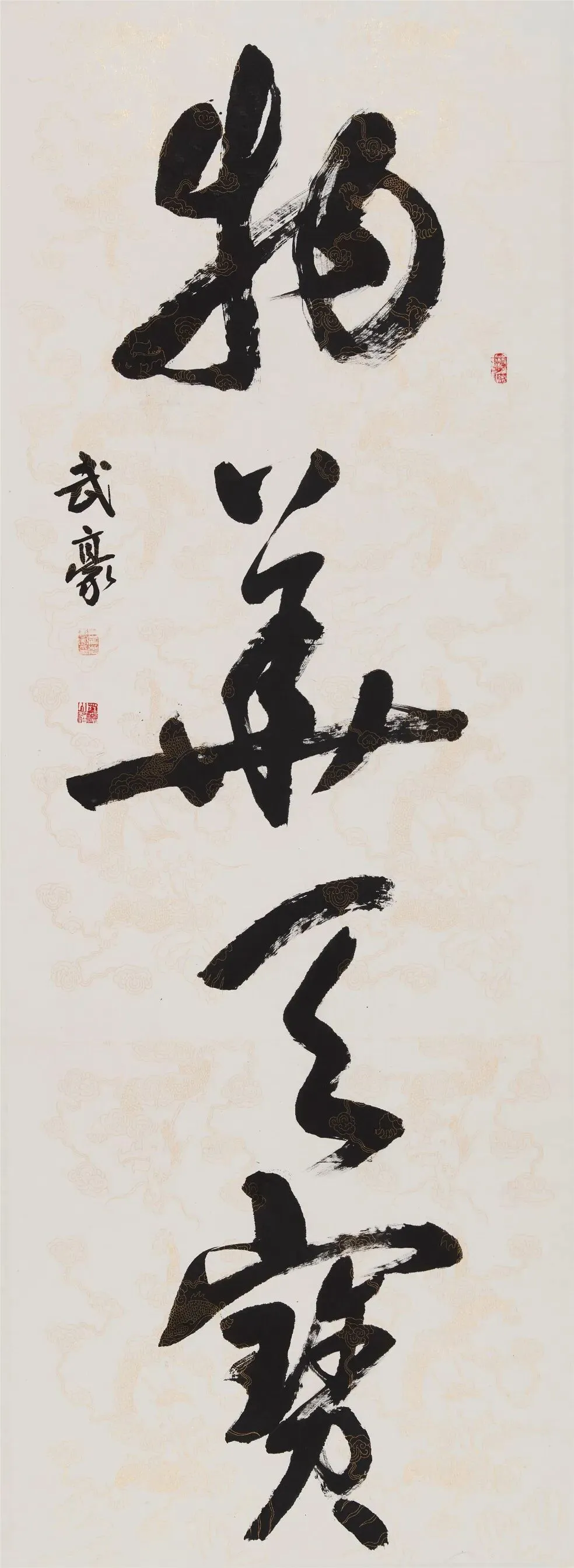 武豪属于“苦学派”。“苦学派”的武豪则有一种精神,也许是聪明的年轻人应该学习的,那就是坚忍不拔,矢志不渝,认准了方向,全力以赴。武豪选择了“二王”一路的行草书,米芾、王铎、赵孟頫、董其昌,乃至今人帖学名家张荣庆,他一个也不放过。近年来,他在王铎行草书中得到真消息,不管是结字、用笔还是章法构成,都能看出武豪书法的渊源关系。当然,他也受到张荣庆用笔爽利痛快、瘦硬的启发,这种纵向与横向的取法整合使其已然形成了自己的面目。他的字从技术上看,入笔切入角度合理,位置肯定,力道准确而笔路清晰,笔力道达到从起到收的全过程。这是一个成熟成家的标志。仅此一点,我就觉得很了不起,殊不见那么多号称“大师”大名头的人都还做不到这一步。在书法中,起笔和收笔无疑是用笔的重要步骤。起笔是行笔的准备,力与势借此而生发。收笔是行笔的结束,能做到沉稳扎实那就是行家了,倘能高妙,我则以为真的大师。然而,毕竟行笔才是书法的主干性存在,所以,书法注重起笔、收笔,更应该在行笔上尤其使转绾结处用功。这方面,客观地道,武豪兄倘有一段路要走,期待兄再上层楼。