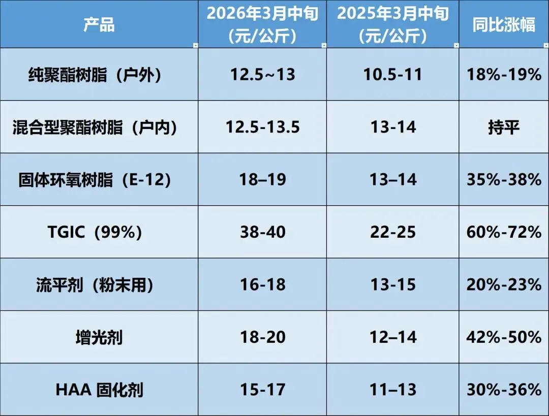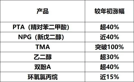 钛白粉、丙烯酸乳液、合成树脂、助剂等核心原料价格集体上扬,环氧树脂从每公斤14元涨至20元,涨幅达43%;TDI原料月内涨幅已达52%。