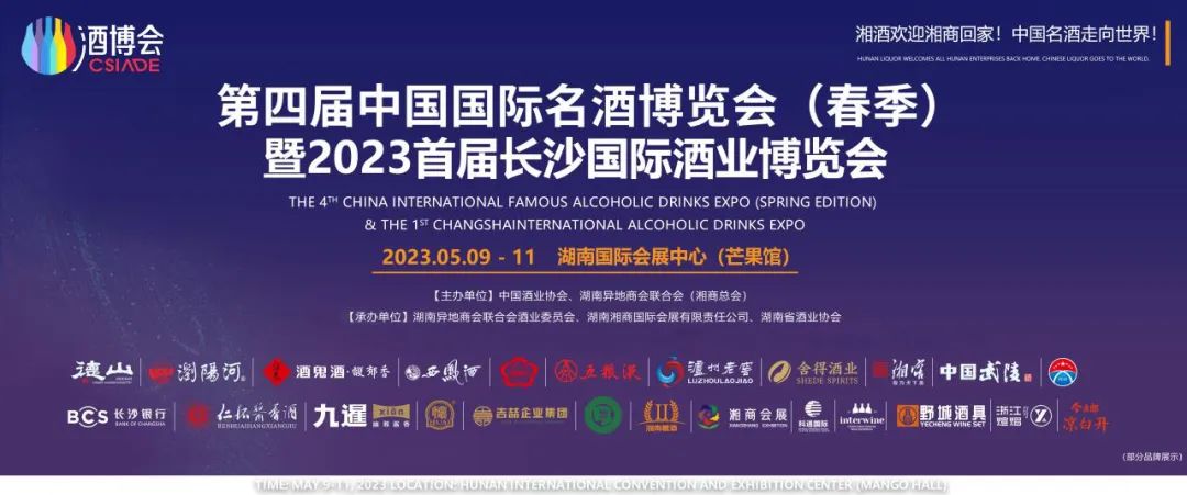 五月举杯,美酒“湘”约!5月9日——11日,由湖南省商务厅、长沙市人民政府、常德市人民政府、邵阳市人民政府、湘潭市人民政府、湘西土家族苗族自治州人民政府共同支持,中国酒业协会、湖南异地商会联合会(湘商总会)主办的第四届中国国际名酒博览会(春季)暨2023首届长沙国际酒业博览会(以下简称“酒博会”)在湖南国际会展中心(芒果馆)举行。