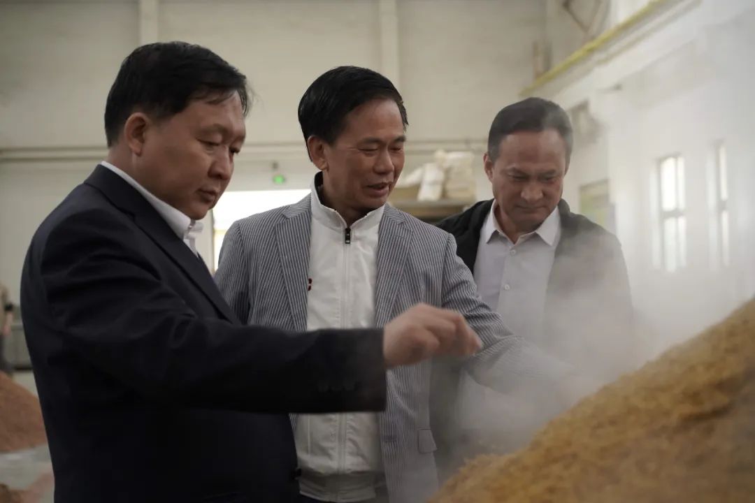 王富强董事长一行先是参观了汾阳王酒酿造车间,汾阳王酒业董事长王再武介绍了汾阳王酒酿造工艺,汾阳王酒坚持“地缸发酵,缓火蒸馏、陶缸贮存”的初心,从粉碎、润糁、清蒸糊化、冷散加曲、地缸发酵、装甑蒸馏,每一个环节都严格遵守千年传承的清香型白酒酿造技艺。考察组在这里亲身感受到了一粒粮到一瓶酒的升华过程,亲眼看到了清雅汾阳王经过重重考验的过程。