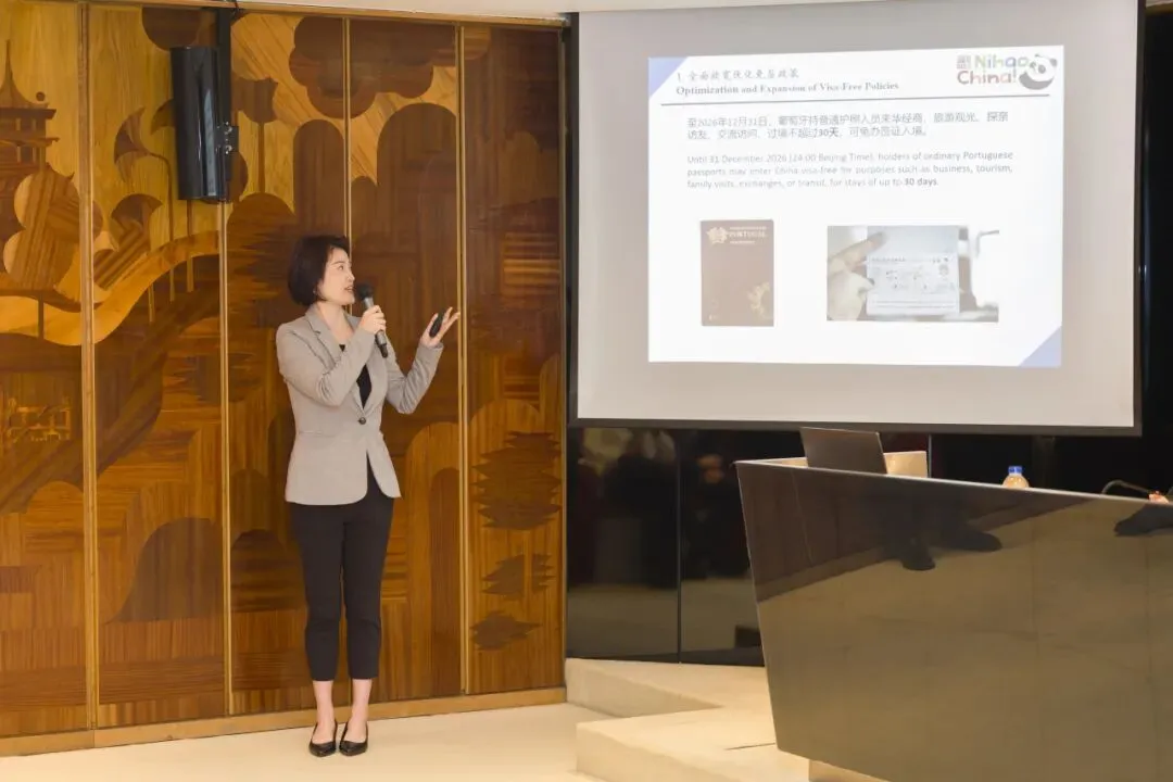 在主题推介环节,中国驻马德里旅游办事处代表介绍了中国入境旅游领域的最新政策措施,围绕免签政策优化、移动支付便利化、国际航班增加、离境退税政策完善以及“你好!中国”国家旅游形象推广等内容进行了详细讲解,全面展示中国在促进入境旅游发展、提升国际游客旅行体验方面所做出的积极努力,为葡萄牙旅游业界深入了解中国旅游市场提供了重要参考。