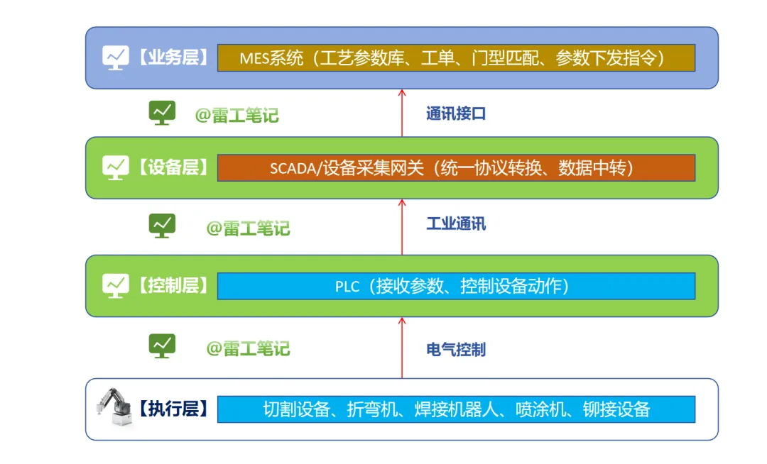 切换防护密闭门 / 密闭门 / 悬板活门等不同门型 切换不同防护等级、尺寸(宽 / 高)、厚度 MES 自动匹配对应切割、折弯、焊接、涂装、铆接工艺参数 自动下发给 PLC,设备自动加载,无需人工手动输入参数 联动 WMS/AGV 自动配送对应物料,实现全流程柔性