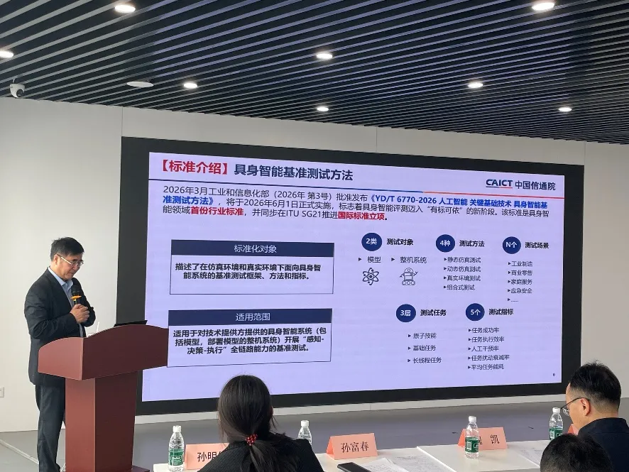 2026年3月26日,工信部人工智能标准化技术委员会(MIIT/TC1)联合多家机构在北京召开会议,正式发布具身智能领域首份行业标准《YD/T6770-2026人工智能关键基础技术具身智能基准测试方法》,该标准将于2026年6月1日实施,并同步推进国际标准立项,优山投资已投企业中科第五纪作为参编单位共同参与标准制定工作。在会议标准宣贯环节,中科第五纪首席科学家、MIIT/TC1具身智能工作组组长、清华大学教授孙富春围绕《YD/T 6770-2026 人工智能 关键基础技术 具身智能基准测试方法》进行宣贯。