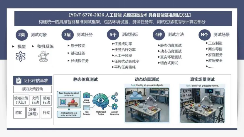 该标准规范了在仿真环境和真实环境下开展具身智能基准测试的环境设置、任务库构建、测试过程和指标计算方法,为具身智能领域构建了统一基准测试框架,标志着具身智能评测迈入“有标可依”的新阶段。目前,该标准已同步在ITU SG21推进国际标准立项。