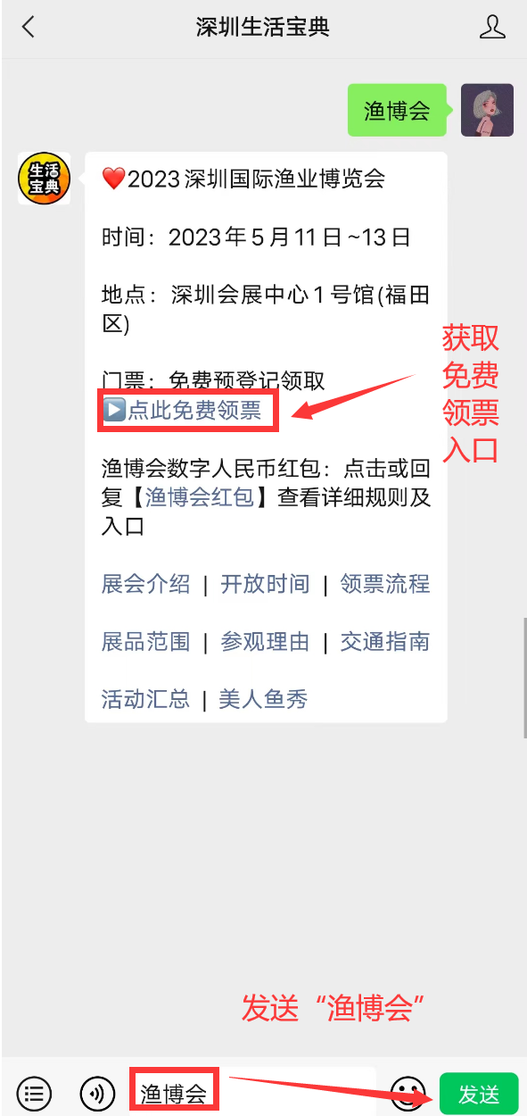 领票入口:扫码或长按识别下方二维码,关注【深圳生活宝典】公众号,在聊天对话框内回复【渔博会】即可获取2023年深圳国际渔业博览会免费登记领票入口