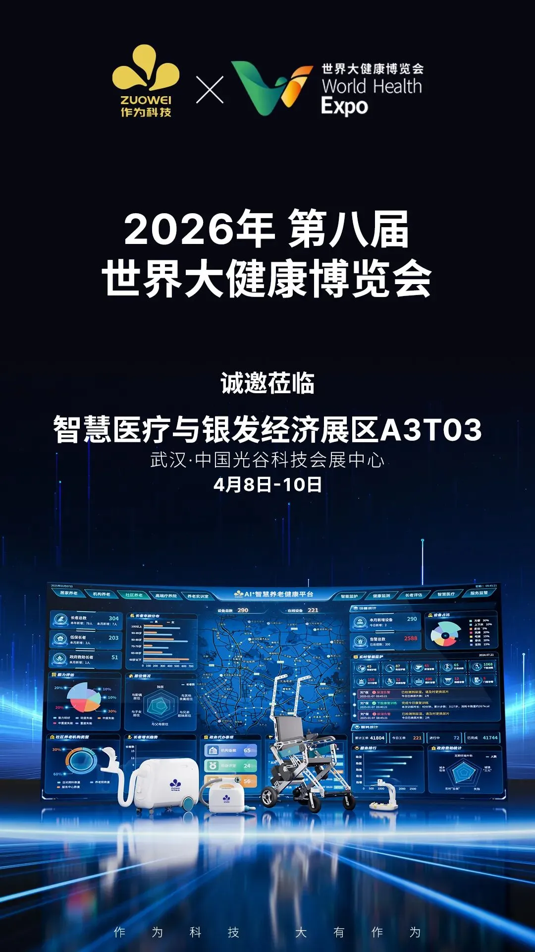 作为科技诚挚邀请全球合作伙伴、行业同仁、投资机构与专业观众莅临,近距离体验前沿科技,深入交流合作意向,共同探索万亿蓝海市场的无限商机,携手推动中国大健康养老产业迈向新高度。