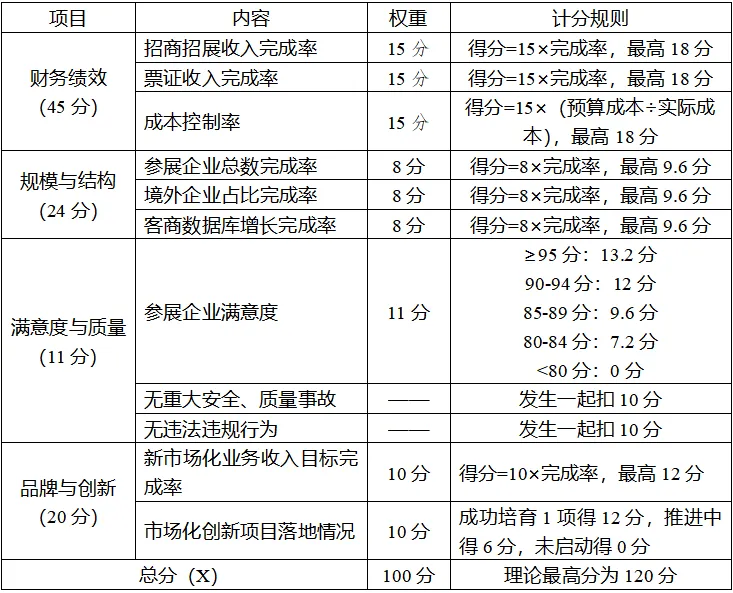 注:1.新市场化业务收入,指除招商招展、门票、品牌合作以外的市场化收入(如吉祥物衍生开发、文创产品销售等),其年度目标在年度执行协议中约定。2.成本控制率采用“预算成本÷实际成本”计算,当实际成本低于预算时得分超过满分,体现节约办展导向。