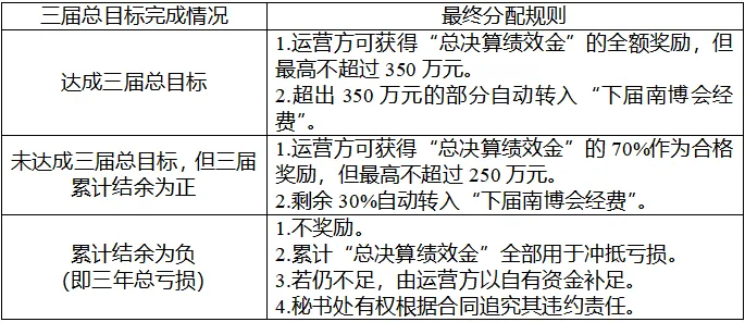 本次合作设定明确的绩效目标,并据此建立动态、分层的收益分配机制。详细规则见附件《第10—12届中国—南亚博览会市场化运营绩效考核评价及收益分配实施方案》,概要如下: