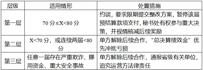 运营方任何一届绩效得分低于80分,将采取约谈、限期整改、单方面解约、通报省级有关部门、追究法律责任等方式进行处置。若发生不可抗力、政策变化等情况时,双方可协商调整协议或绩效目标。