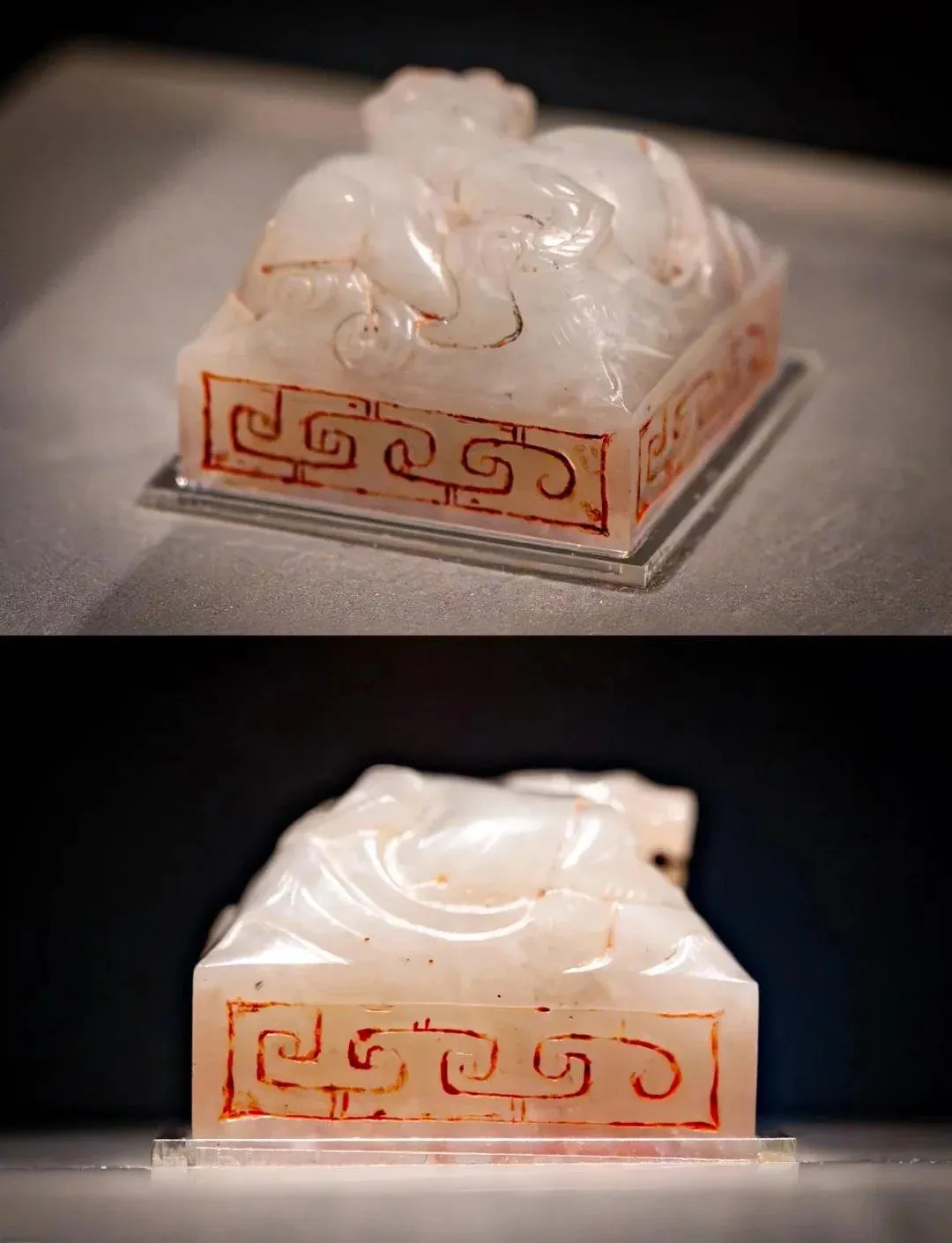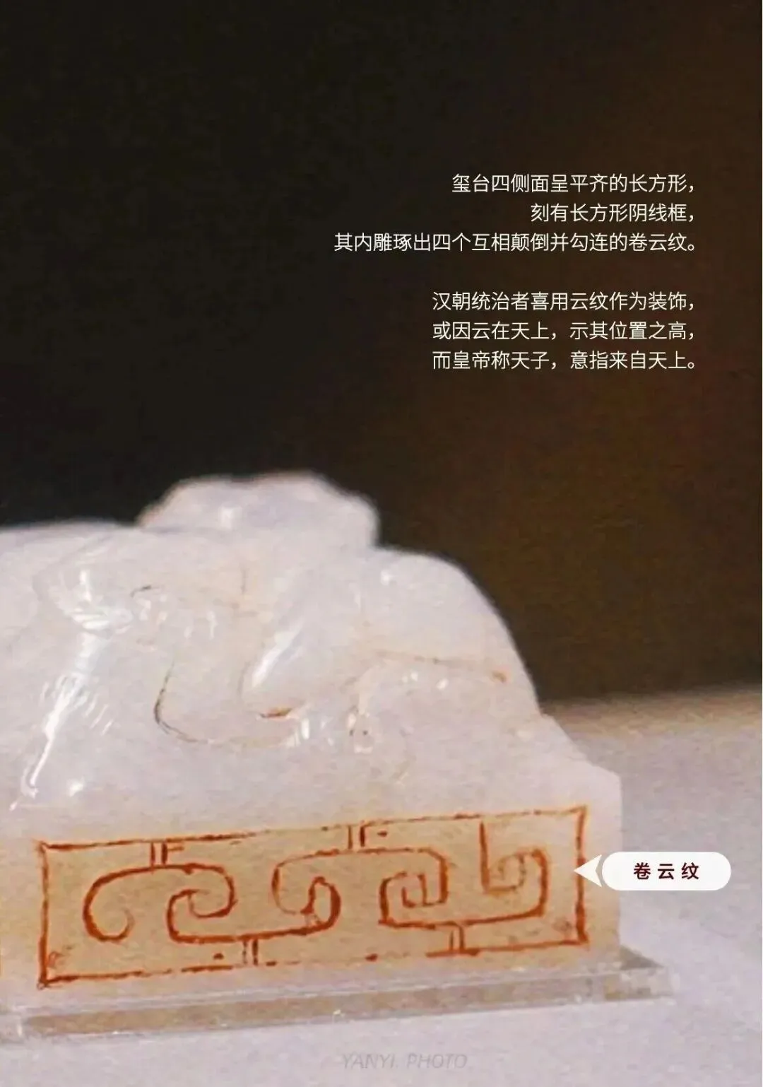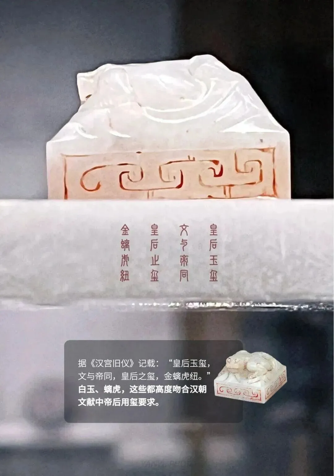 玉玺钮部为高浮雕的匍匐螭虎形,形象凶猛矫健,双目圆睁,张口露齿,尾部上翘,腹下有透孔可供穿绶系带,象征皇权威仪。玺台四侧面阴刻勾连卷云纹,线条规整流畅,体现汉代装饰风格。印面阴刻篆书“皇后之玺”四字,字体方正匀称,笔画粗细一致,是典型的汉代篆书风格,与《汉旧仪》中“皇后玉玺,文与帝同,皇后之玺,金螭虎钮”的记载完全吻合 。