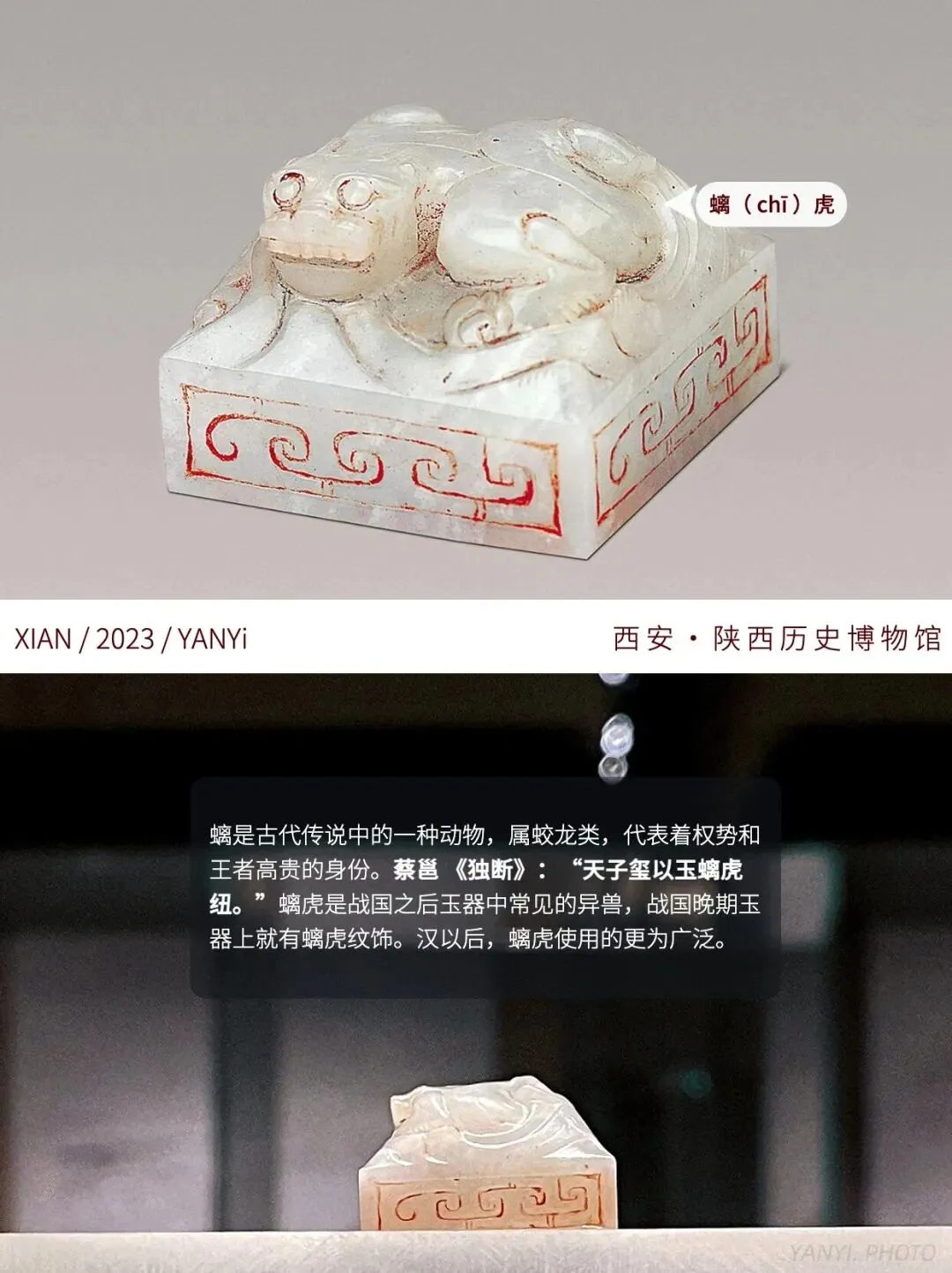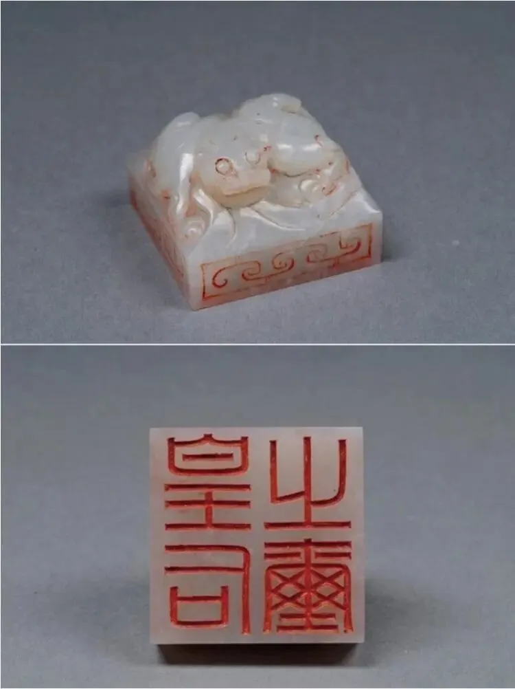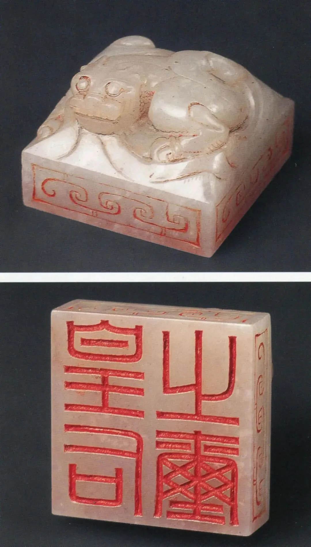 玉玺钮部为高浮雕的匍匐螭虎形,形象凶猛矫健,双目圆睁,张口露齿,尾部上翘,腹下有透孔可供穿绶系带,象征皇权威仪。玺台四侧面阴刻勾连卷云纹,线条规整流畅,体现汉代装饰风格。印面阴刻篆书“皇后之玺”四字,字体方正匀称,笔画粗细一致,是典型的汉代篆书风格,与《汉旧仪》中“皇后玉玺,文与帝同,皇后之玺,金螭虎钮”的记载完全吻合 。
