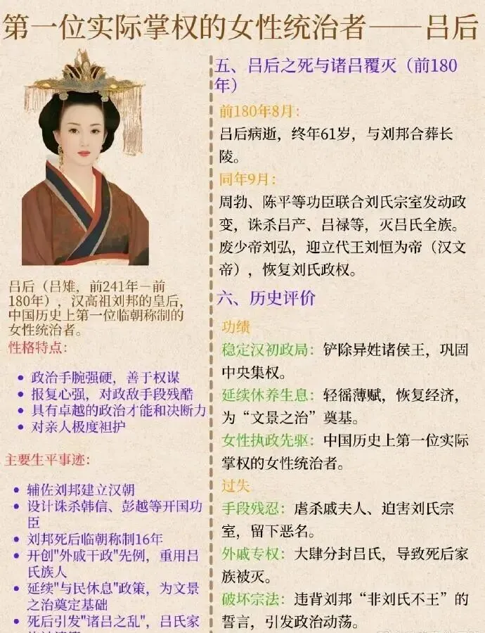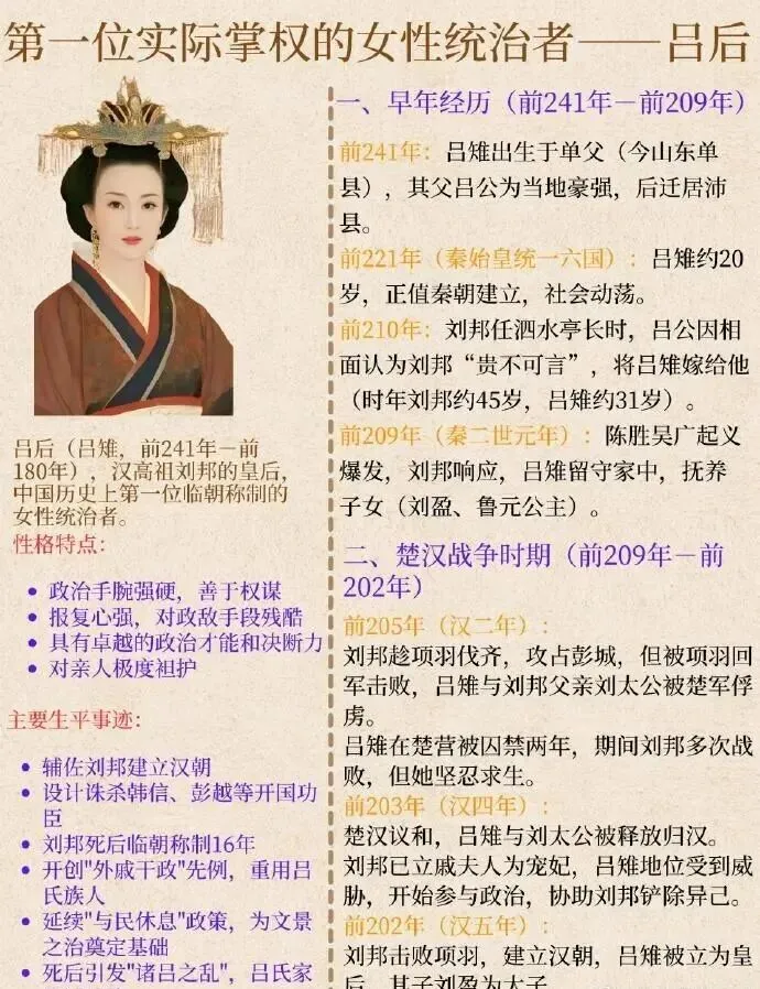 吕雉(前 241 年 — 前 180 年),字娥姁,汉高祖刘邦的皇后,中国历史上第一位皇后、皇太后,也是首位临朝称制、实际执掌全国政权的女性统治者。她的一生充满传奇与争议,既是辅佐刘邦定天下的政治伙伴,也是铁血狠辣的权力掌控者,更是为 “文景之治” 奠基的务实政治家。