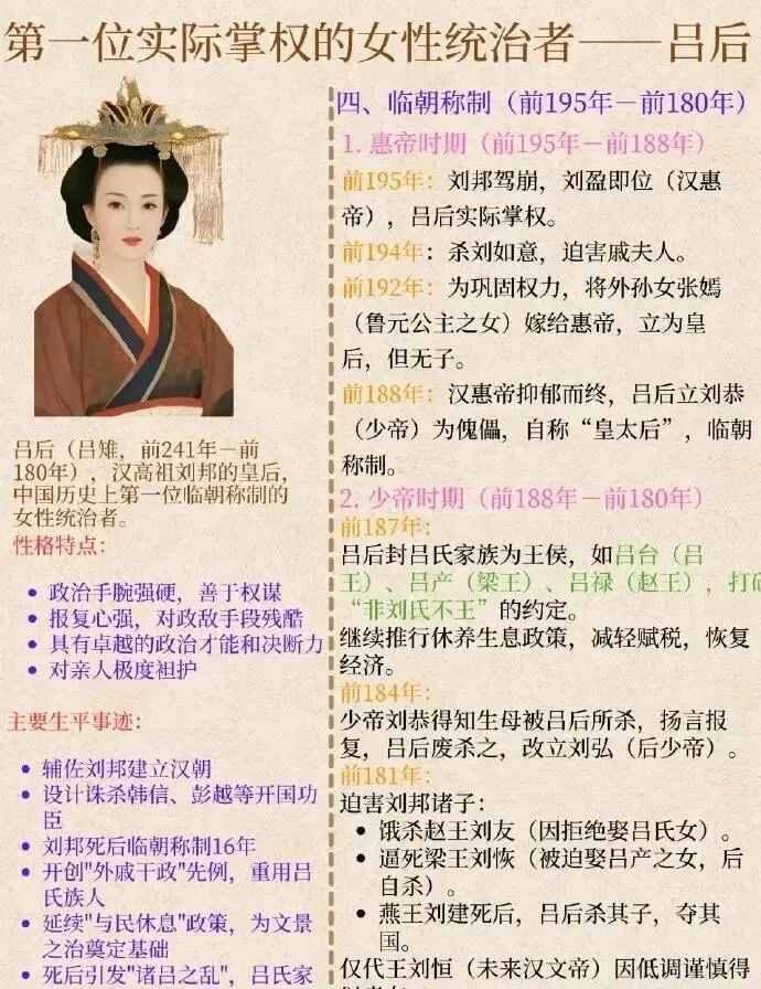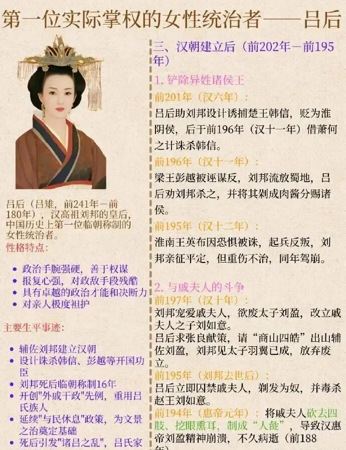 前 195 年刘邦驾崩,太子刘盈即位(汉惠帝),吕雉被尊为皇太后。因惠帝仁弱,吕雉开始独揽大权,前后掌权达 16 年,成为中国历史上女主执政的开端。刘邦死后,吕雉立即将赵王刘如意召回长安,用毒酒将其毒死。她将戚夫人砍去手足、挖去双眼、熏聋双耳、灌下哑药,扔入厕所,称为 “人彘”,并让惠帝观看。此举直接导致惠帝精神受创,从此不理朝政,饮酒作乐,年仅 23 岁便忧郁而死。她先后迫害、杀害刘邦的其他儿子(如赵王刘友、刘恢),打压刘氏宗室势力。
