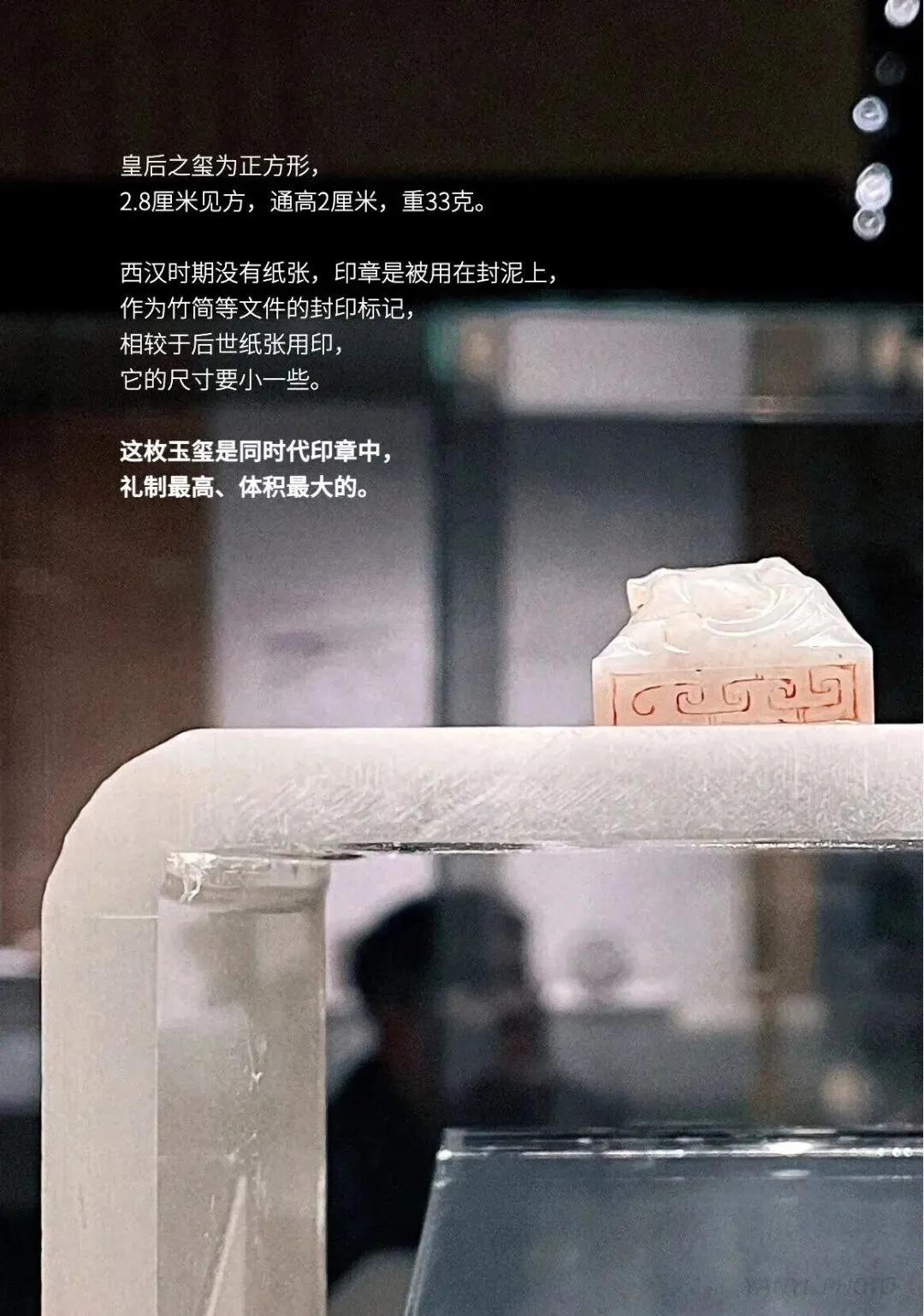 这枚玉玺1968年出土于陕西省咸阳市韩家湾狼家沟村,由当时年仅13岁的学生孔忠良偶然发现。玉玺以新疆和田羊脂白玉雕成,质地纯净无瑕、晶莹润泽,通体未受沁,展现出极高的玉质与工艺水平。其边长2.8厘米,通高2厘米,重33克,形制为正方形,符合汉代帝后玺印的规制。