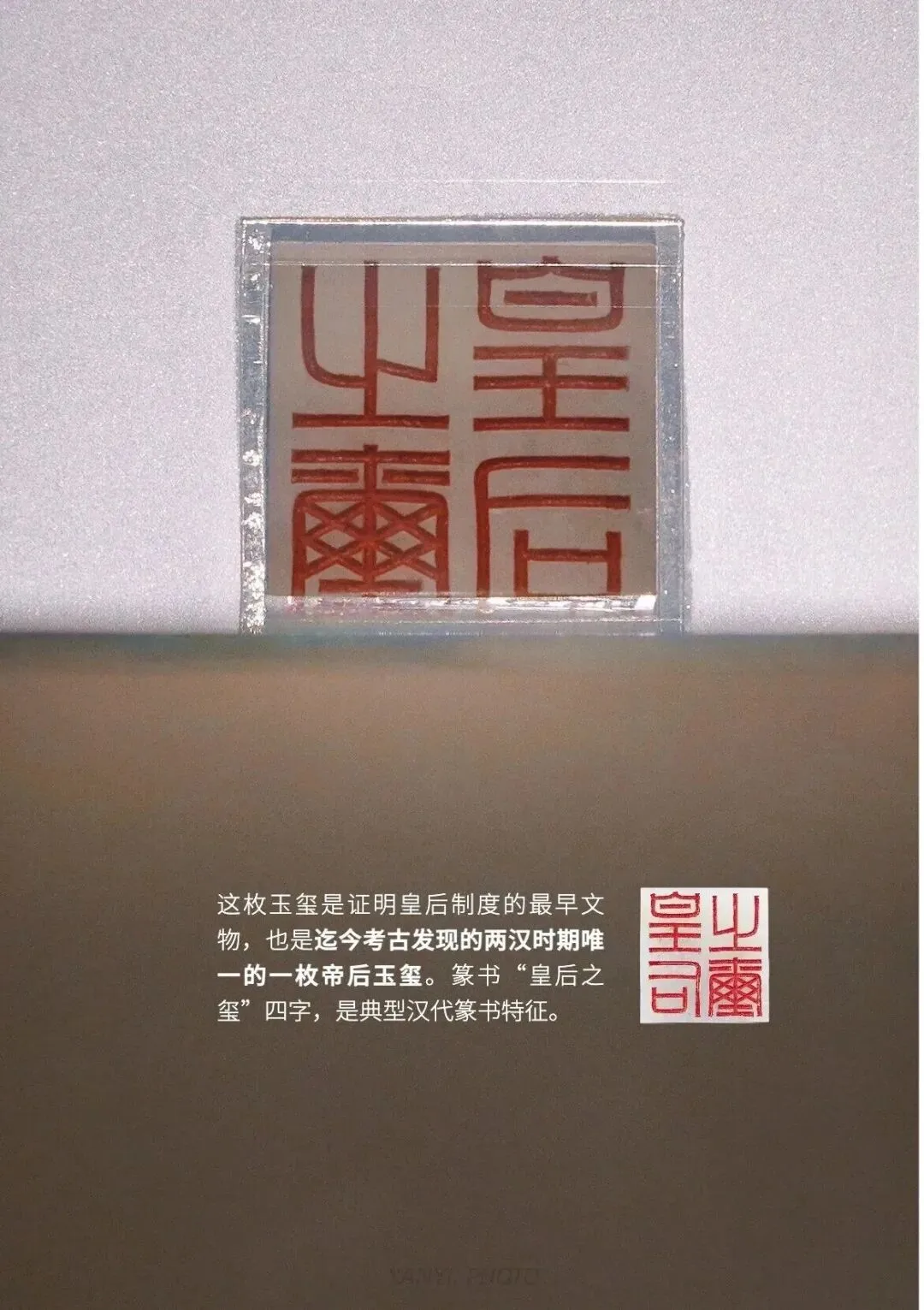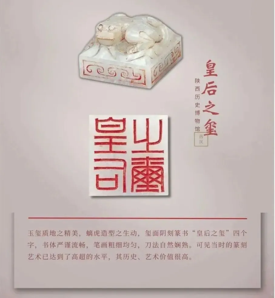 西汉“皇后之玺”玉玺是迄今发现的唯一一枚汉代皇后玉玺,也是我国最早发现的皇后印玺,玉玺以新疆和田羊脂白玉雕成,纯净无瑕,通体未受沁,其出土地点距汉高祖与吕后合葬的长陵仅约1公里,学界普遍推测为吕后生前所用之物 ,现藏于陕西历史博物馆。