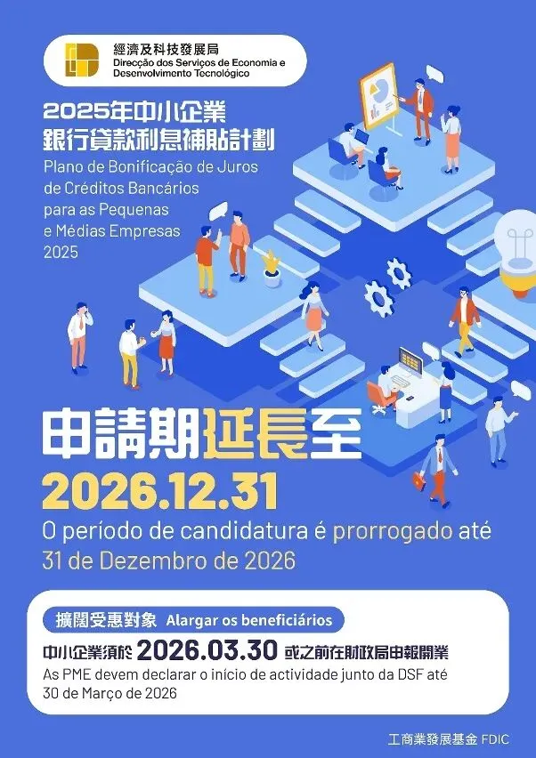 為持續優化本澳營商環境、支援中小企業穩健經營,經濟及科技發展局於2025年4月推出的《2025年中小企業銀行貸款利息補貼計劃》之申請期將延長至2026年12月31日。自計劃推出以來,至今已收到近2,100宗申請,並已批准逾2,000宗,涉及的銀行貸款總金額約45億澳門元,有效緩解中小企業的資金流動性需求。