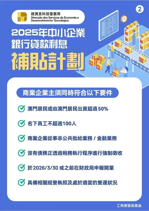 為擴大受惠企業範圍,“2025利息補貼計劃”申請對象的資格條件調整為“於2026年3月30日或之前已向財政局申報開業的商業企業”。符合資格的中小企業,凡獲得由澳門持牌銀行批准用於企業營運的資金貸款,可透過銀行申請貸款利息補貼,每一商業企業主的貸款額上限為500萬澳門元,補貼期最長3年,年補貼率上限4厘,銀行貸款額總額上限100億澳門元。