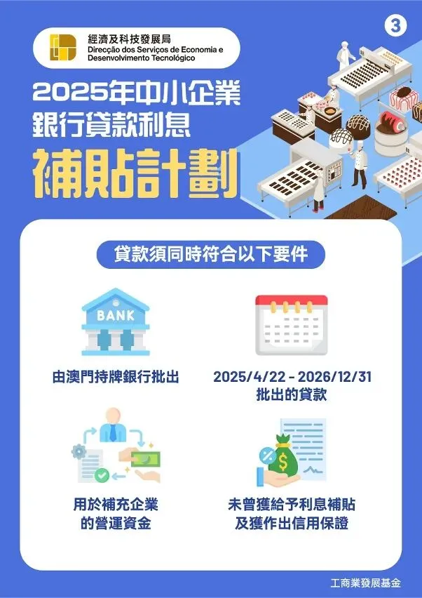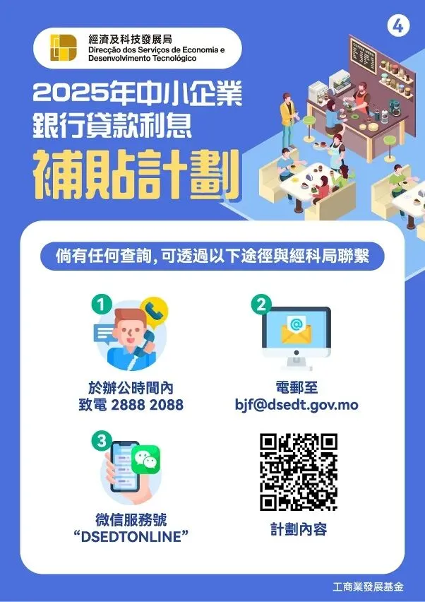 “2025利息補貼計劃”詳情可瀏覽經科局網頁(https://www.dsedt.gov.mo/zh_MO/web/public/pg_sme_bjcf)。如有任何查詢,可電郵至bjf@dsedt.gov.mo,亦可於辦公時間致電2888 2088或透過微信服務號“DSEDTONLINE”與經科局聯繫。