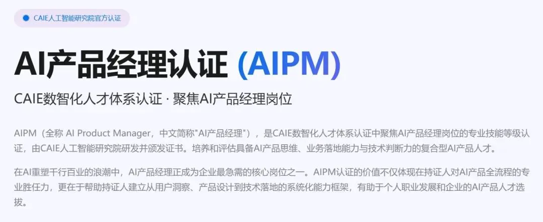 AIPM(AI Product Manager,中文简称“AI产品经理”)是面向AI产品岗位能力的专业认证,由CAIE人工智能研究院研发并颁发。
