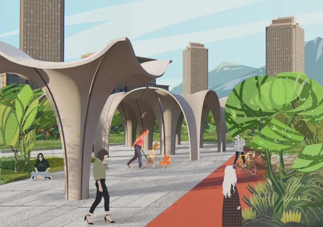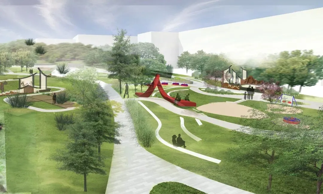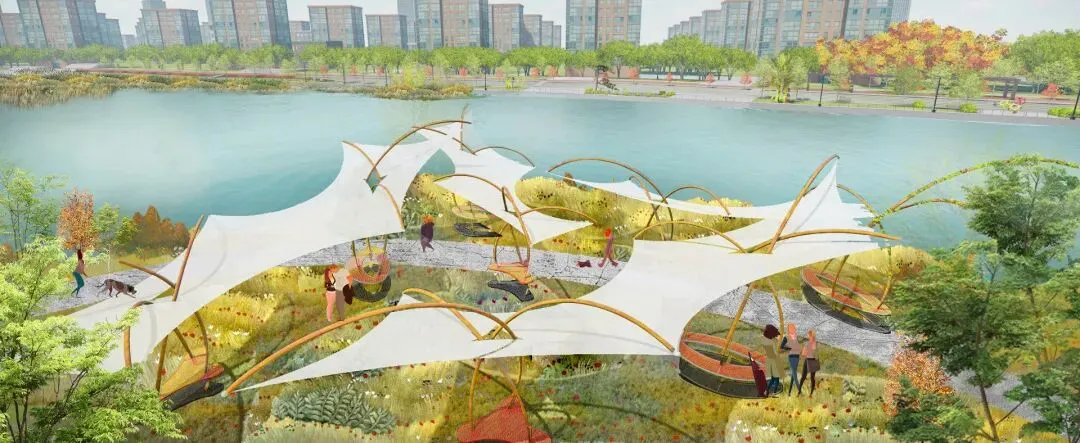 文字说明:此次滨河公园设计中采用了曲线串联节点揉合叙事性与相邻纪念公园相辅相成。