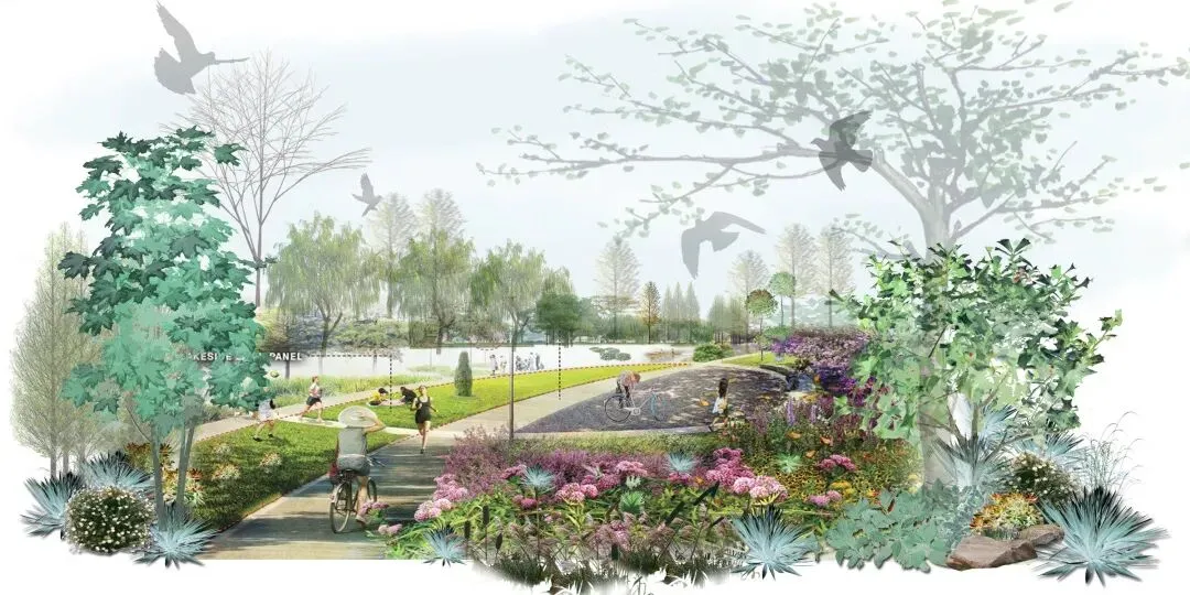 文字说明:项目整体引入蜿蜒的形态,规划以“一环、一湖、四区”为主的景观结构,结合不同的景观主题,给人丰富的体验。