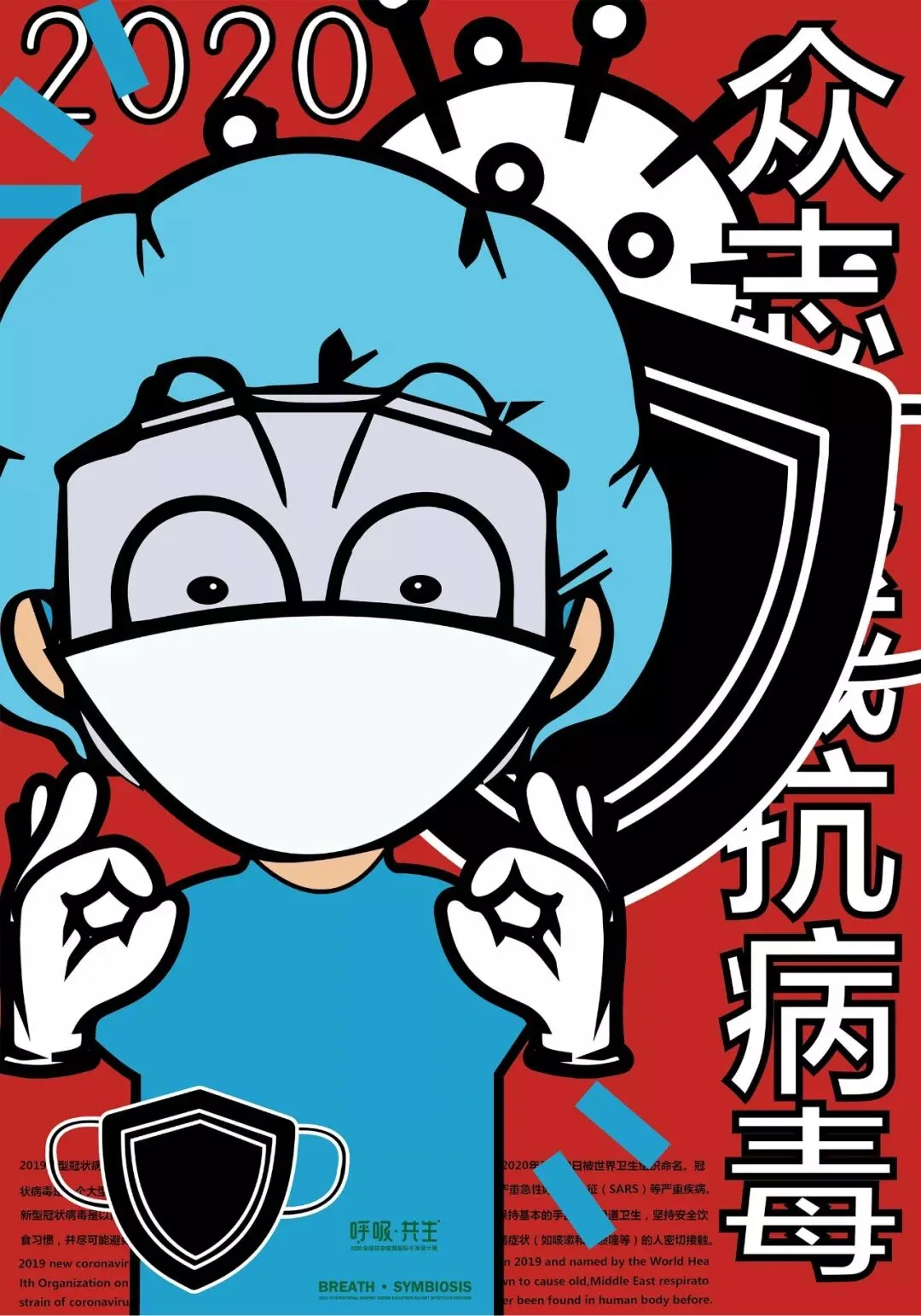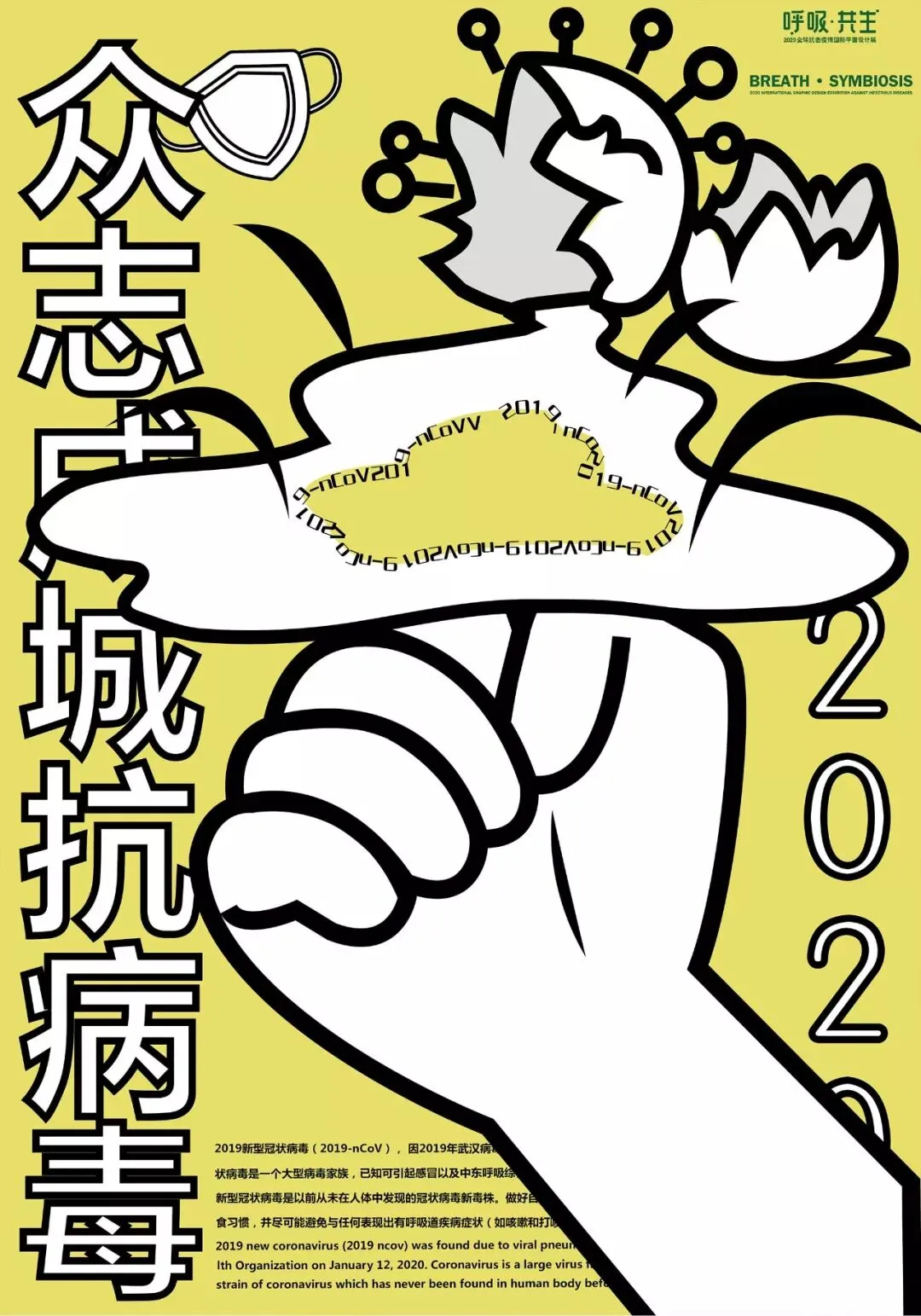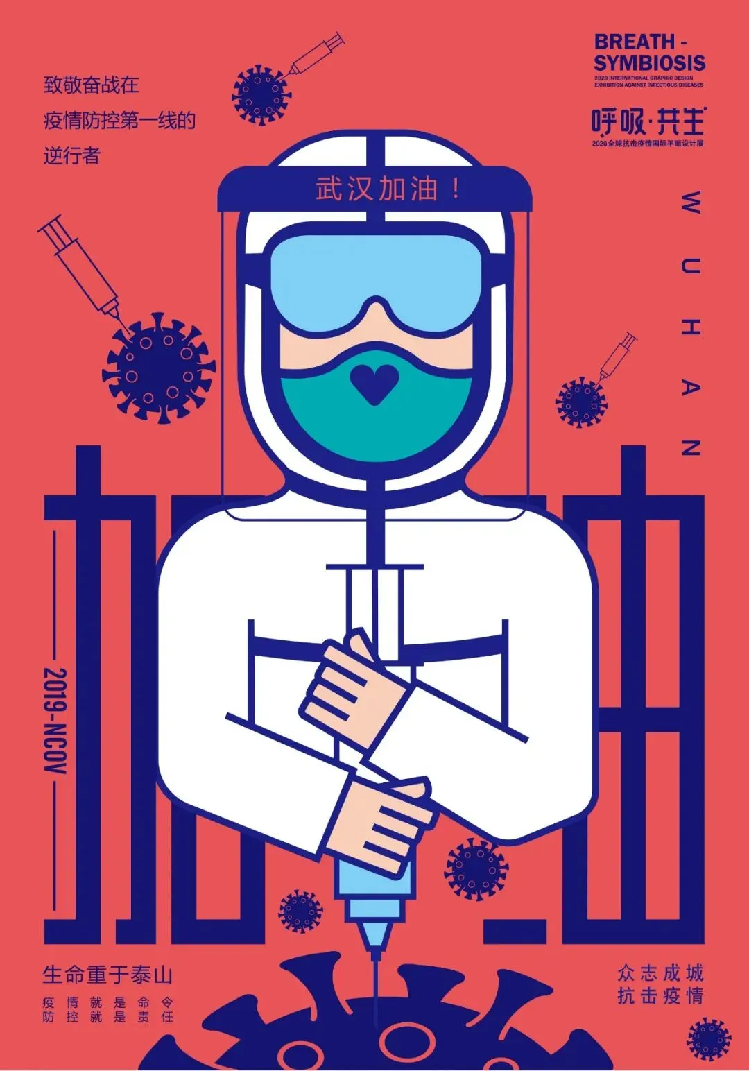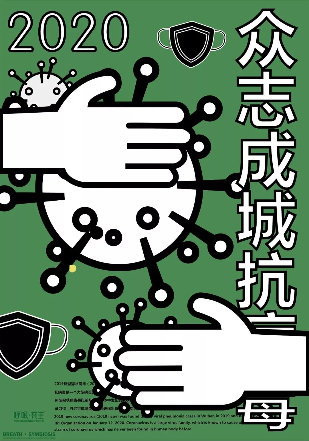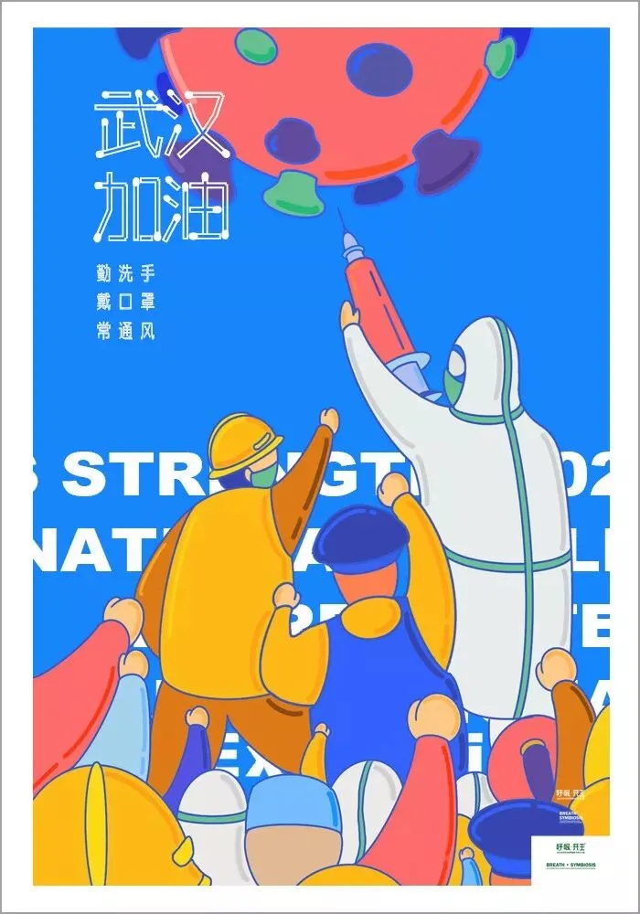 中国在全国人民辞旧迎新之际,遭受了从武汉向全国蔓延的“新型冠状病毒感染肺炎疫情”。要求紧紧依靠人民群众坚决打赢疫情防控阻击战,全国上下紧急部署动员,掀起了“防控感染,抗击疫情”斗争,书写了一个又一个感人的故事。在这个万众一心、同抗疫情的重要时刻,新青年设计师联盟、合肥平面设计联盟等联合国内高校、设计机构呼吁全球设计师群体,以“呼吸·共生”为主题设计作品,大家“同呼吸、同命运”,用设计力量抗击“新型冠状病毒”,讴歌抗疫精神、宣传防疫知识、倡导人与自然和谐共生。