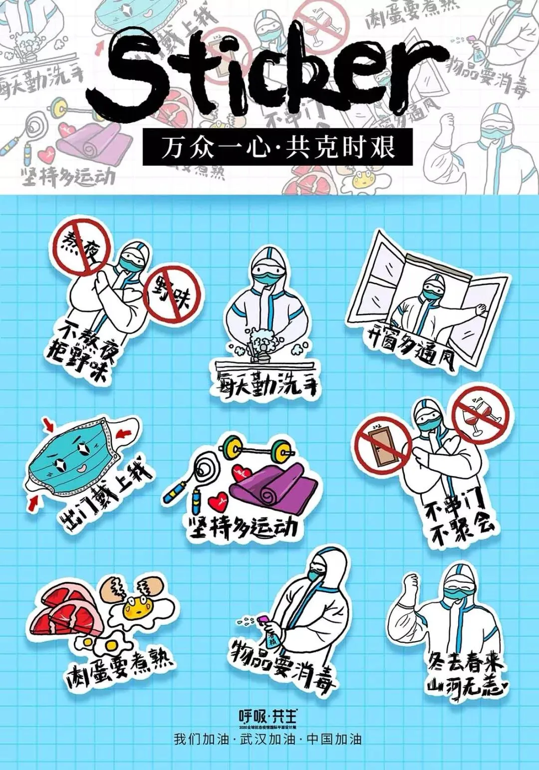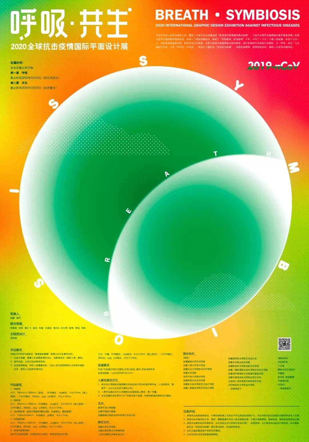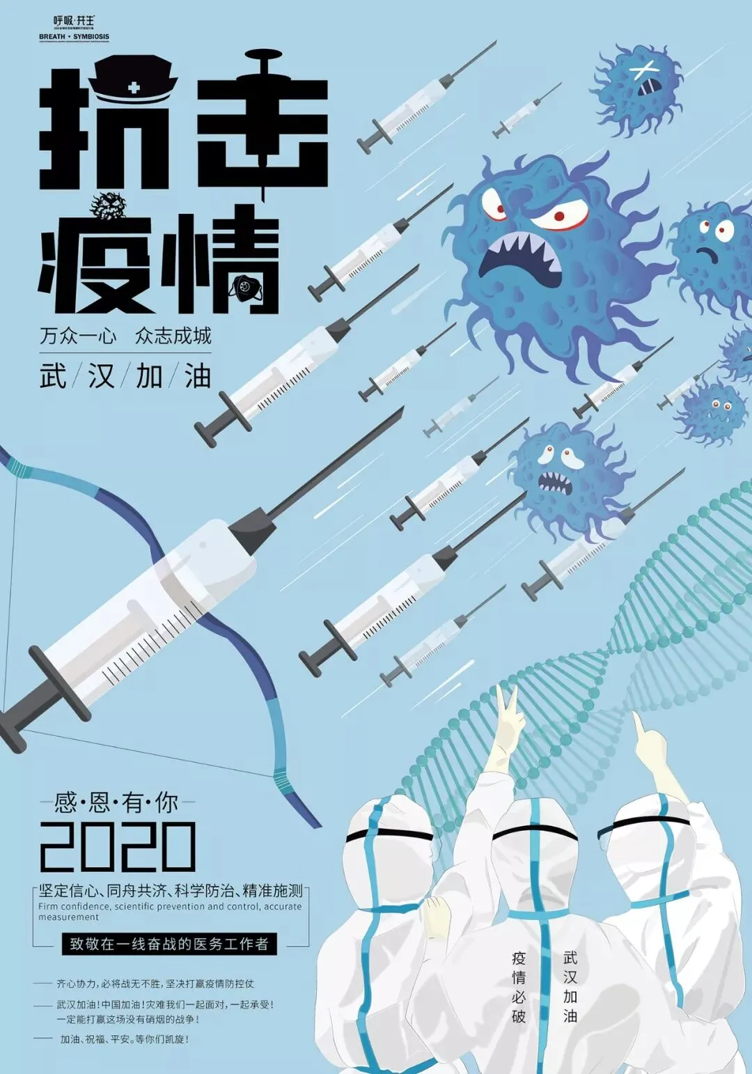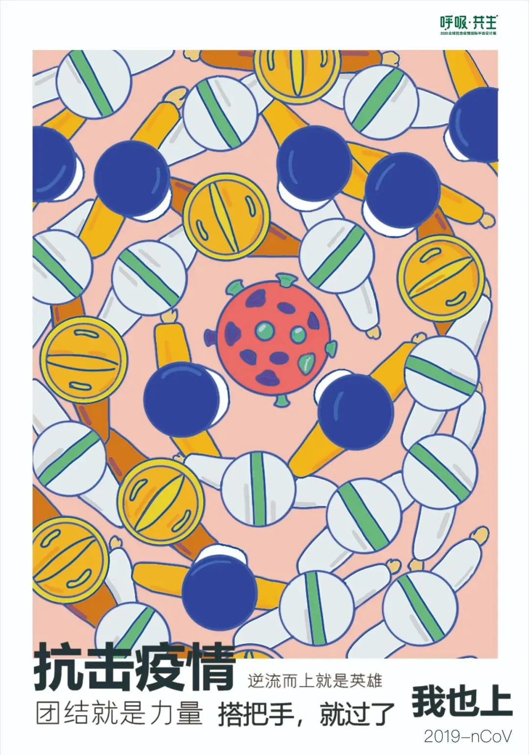 中国在全国人民辞旧迎新之际,遭受了从武汉向全国蔓延的“新型冠状病毒感染肺炎疫情”。要求紧紧依靠人民群众坚决打赢疫情防控阻击战,全国上下紧急部署动员,掀起了“防控感染,抗击疫情”斗争,书写了一个又一个感人的故事。在这个万众一心、同抗疫情的重要时刻,新青年设计师联盟、合肥平面设计联盟等联合国内高校、设计机构呼吁全球设计师群体,以“呼吸·共生”为主题设计作品,大家“同呼吸、同命运”,用设计力量抗击“新型冠状病毒”,讴歌抗疫精神、宣传防疫知识、倡导人与自然和谐共生。