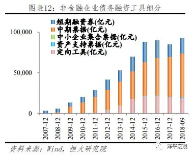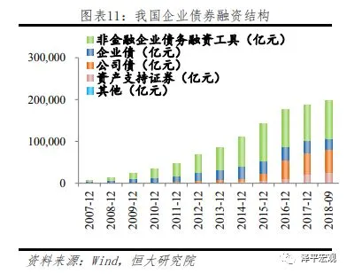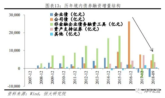 从增量来看,从稳步增加到快速缩量,债券融资增长承压。债券融资增长主要分三个阶段;(1)2016年前,非金融企业债务融资工具为企业融资的主要增量来源,其他各项规模稳步增长;(2)2016年在宽流动性环境下,公司债发行一枝独秀,占比由2015年12%提高至2018年28%,重要性显著提升;(3)2017年起,债券融资全面哑火,除公司债以及资产支持证券仍保持增长外,其他债券融资规模均显著收缩。今年前9个月债券融资有所回暖,新增非金融企业债务融资工具规模达9736亿元,已大于前两年净增量之和,而受今年信用风险频发影响,公司债发行难度加大,新增量有限,债券融资增长承压。债券融资、银行信贷及非标融资三者关键均在于到期再融资问题,“大开大合”的债券融资形势使得今年以来大量债券到期再融资受阻,信用违约事件频发,恶化企业融资环境。