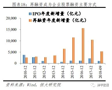 具体在股票融资领域,IPO融资量在近10年基本保持平稳,占融资存量比例不断下降,而再融资规模自2014年以来快速上升,显著超越IPO融资规模,逐渐占据A股企业股票融资主导地位。截止2018年9月末,IPO及再融资规模比例约为1:4。