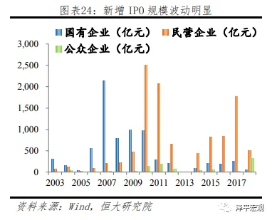 从增量上看,从2014年起,民营企业当年股票融资规模均超过国有企业,成为A股市场融资主力,对于股票融资依赖度显著提升。而2016年融资热潮结束后,股票市场新增融资量持续收缩,企业融资渠道收窄。从融资方式来看,国有企业IPO大潮基本在2011年结束,后续主要以再融资方式为主,而民营企业IPO融资显著受到监管以及市场环境影响,2010年至今呈现“高-低-高”波动趋势。再融资方面,国企及民企再融资规模占比均不断提高,2016年民营企业再融资快速提升,当年新增超过6000亿元,而2017年至今呈现明显收缩态势。