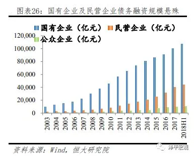 与股票融资相比,国有企业及民营企业债券融资规模呈现明显两极分化。截止2018年半年末,我国上市国有企业债务融资余额超过10万亿,同期上市民营企业债务融资余额4.4万亿元。从平均值来看,上市中央国企平均债务融资规模超300亿,地方国有企业平均债务融资规模超110亿,而上市民营企业平均债务融资规模不足50亿元。