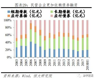 由于上市企业仅披露按照期限划分的短期借款及长期借款,难以就实际借款方式进行进一步划分,我们通过其他数据来源判别银行贷款及非标融资结构。近期,中国财政科学研究院出版2018年“降成本”专题调研报告,将企业融资方式划分为银行贷款、债券融资、股权融资以及其他融资,其他融资具体指信托、融资租赁等,与非标融资定义相仿。调查数据显示,整体而言,国有企业借款结构中,银行贷款占据绝对主导地位,2015至2017年非标融资规模占比约为3%-7%,非标融资渠道的收缩对于国有企业融资影响较为有限。而民营企业对于非标融资依赖程度显著较高,2015-2017年占比分别为43.9%、38.3%以及15.4%,接近一半的借款均来自于非标渠道,受金融监管加强影响,民营企业融资难度自然显著加大。