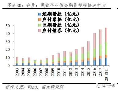 从增量上看,民营企业在2013年至2016年平均债务融资规模快速扩大,主要以债券融资方式为主,是这一轮上市民营企业快速加杠杆的重要工具。2017年债券市场萧条,债券融资锐减,但企业短期及中长期借款能有较好支撑。而2018年债券融资市场虽然环比回暖,但市场风险偏好下降,民企发债困难,叠加金融严监管下表外融资收缩,短期及长期借款新增规模明显收缩。2017年及2018年上半年上市民营企业平均债务融资增量环比下降55%及46%,融资压力持续积攒。