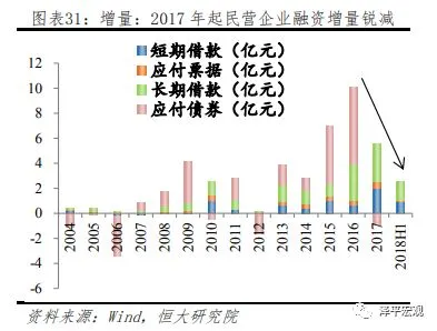 在金融周期顶部加强金融监管具有高度前瞻性及必要性,然而问题在于,在现有融资结构下,加强金融监管,又缺乏后续的融资方式接力,民营企业、依赖非标融资的行业必然首当其冲受到影响,面临显著的融资难问题。一是难在表外融资渠道收缩,民营企业债券融资难度加大,部分前期债券及非标融资较为激进的民营企业再融资渠道枯竭,债务违约压力陡增。二是难在即使表外回表、贷款对实体经济的支持力度上升,但是贷款结构恶化,企业中长期贷款及短期贷款增速下降,仅通过票据融资及个人经营性贷款支撑实体企业融资。