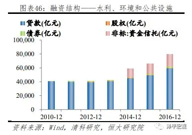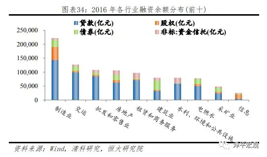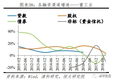 重工业行业主要包括采矿、电力、燃气及水的生产和供应业等行业,融资需求量大。重工业及制造业融资结构较为相似,在融资来源中,银行贷款占比均为60%上下,且由于表内贷款对于过剩产能行业的监管较严,增速较慢。然而和制造业更加依赖股权融资不同(占比约21%),重工业企业多为国有企业,具有政府隐性担保,更易实现债券市场融资(占比约26%),除此之外,2016年末重工业股权融资占比约11%,非标融资占比有限,仅3.4%。