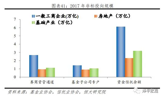 房地产行业是非标的主要投向之一。房地产行业资金需求量大,然而面临房地产调控、融资政策收紧等一系列监管约束,融资转而诉诸于非标渠道。非标的具体投向缺乏统计数据,我们通过两个方面可窥知一二。一是基金业协会和信托业协会数据显示,2017年券商资管定向通道业务投向融资类业务4.97万亿元中的9469亿、基金子公司专户3.59万亿中0.88万亿、资金信托余额(按投向)21.9万亿中2.28万亿均投向房地产,总计4.11万亿,已超当年房企债券规模的2倍。二是从资金信托总体行业投向看,投向房地产行业金额多年来仅次于金融业、租赁和商务服务业,截至2018年上半年,投向房地产业的资金信托余额为2.57万亿。