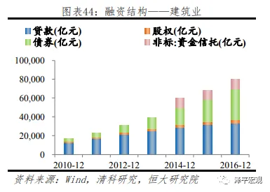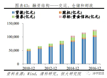 基建相关行业主要包括租赁和商务服务业,交运、仓储和邮政,建筑业以及水利、环境和公共设施四大领域。由于基础设施建设领域融资量大,相关行业融资总量长期处于全部行业前七水平。从结构上看,基建相关行业股权融资占比微乎其微,高度依赖债务融资,占比均在95%以上,其中又可分为二类,一是交运和建筑行业,由于抵押品较多,银行表内信贷支持力度大,发债难度较低,债务融资偏重银行贷款及债券,其中建筑业的债券融资比例更是接近银行贷款占比,均为40%上下。二是租赁和商务服务业以及水利行业,大部分地方政府融资平台归入租赁及商务服务业,在新预算法实施后,仍然承担着部分隐性债务融资功能,继而也成为非标融资的重要对象,银行贷款以及非标融资占比分别为75%以及20%左右。