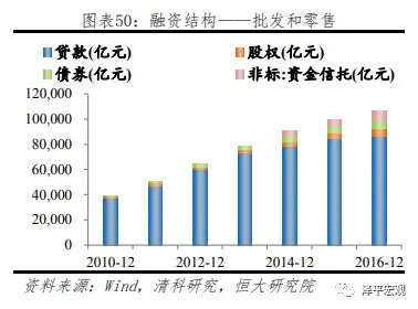 批发零售业服务于工业企业流通环节,行业融资量大,对现金流的要求很高,对贷款的依赖程度高,占四种融资方式余额的80%以上。截至2016年,贷款占比80.9%,资金信托占比7.2%,债券占比6.5%,股权占比5.4%。