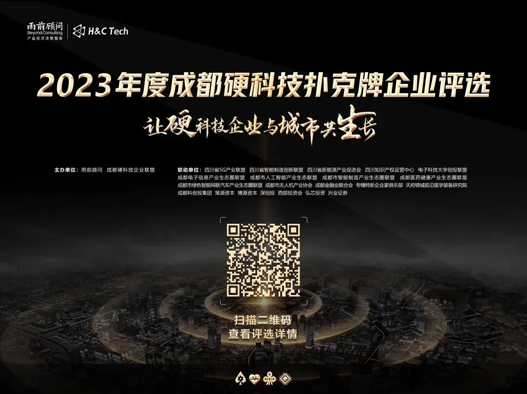 同时,针对“成都硬科技扑克牌”企业提供的免费增值服务正在一项一项履行,旨在为上榜企业提供全方位支持,助力其迈上新的台阶。雨前顾问热切期待更多的成都硬科技企业参与,携手共促硬科技创新与发展。此外,“2023年度成都硬科技扑克牌”企业评选采用线上报名、全程免费,请长按识别下方二维码或点击阅读原文进入报名系统,填写并提交报名信息。报名系统开放时间:2024年1月2日-1月31日。详情可咨询:祝老师18328706545(微信同号)