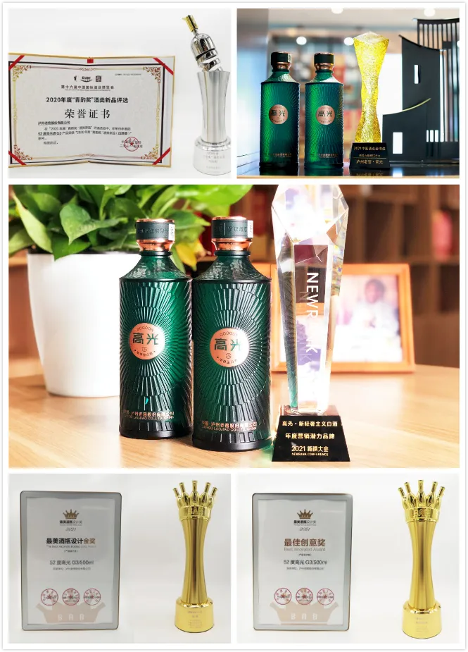 3月27日,荣膺2021新榜大会“年度营销潜力品牌”奖;4月6日,荣膺2021年中国酒业金樽奖“新势力品牌TOP10”奖;4月9日,荣膺2021最美酒瓶设计金奖、2021最美酒瓶设计奖最佳创意奖;不到20天,连获5项大奖,“高光”荣耀不止。在业界看来,这再一次展示了高光的不凡实力,体现了高光作为引领中国轻奢白酒生活方式、助力艺术品味走向世界的扛旗者的地位。