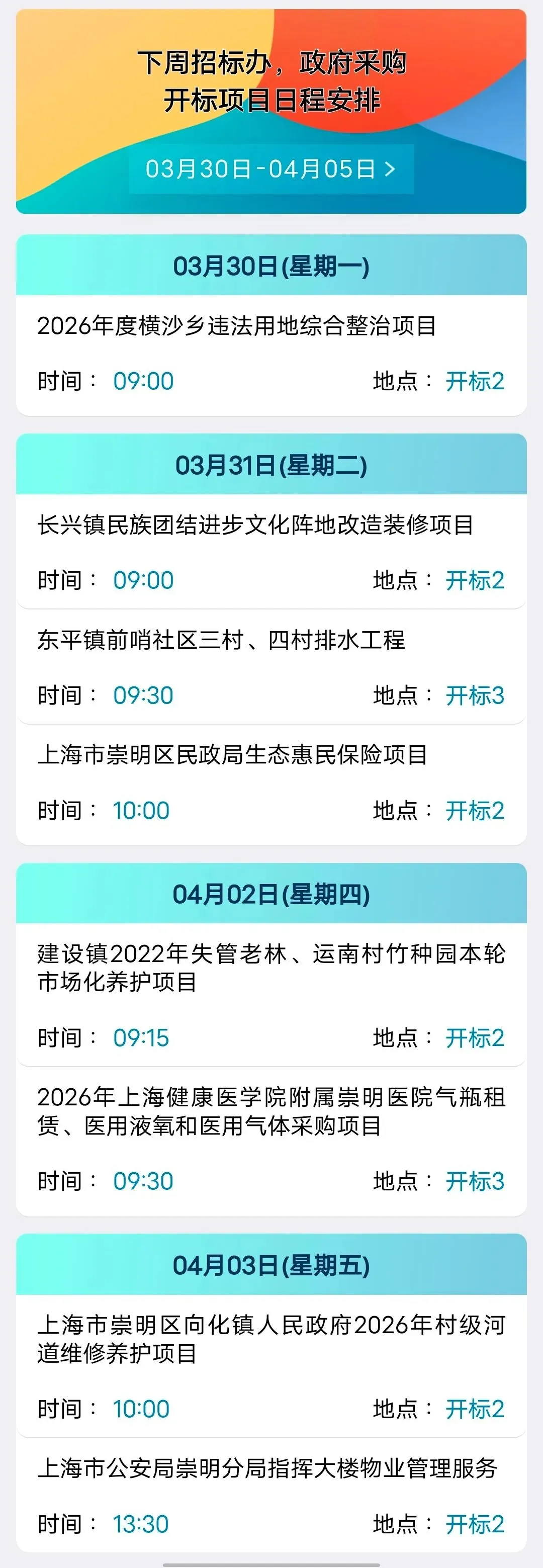 【日程安排】下周招标办、政府采购开标项目日程安排(3月30日-4月5日)