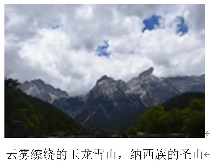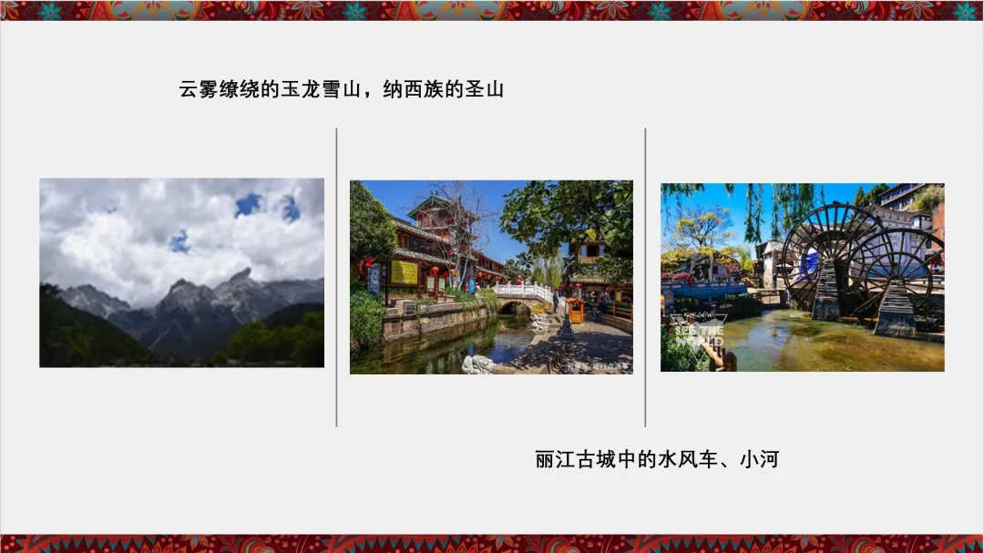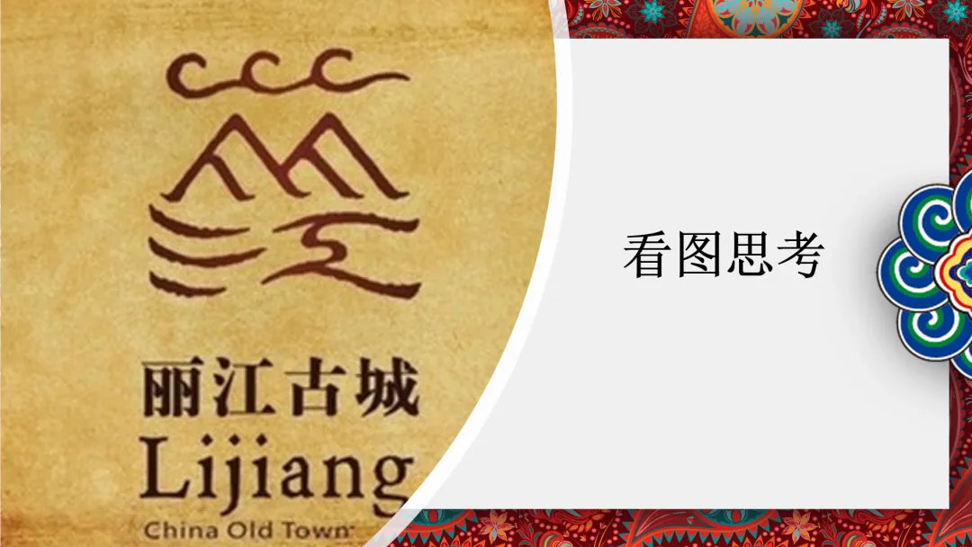 看图思考:上图是丽江古城的标志,记录并体现了纳西族人民的生产生活。请同学们看图思考,丽江古城的标志是由什么构成的?——水、山、云。整个标志给人一种什么样的感觉呢?——给人一种浑然天成和淳朴忠厚的民风感觉,将丽江古城的深厚历史感味儿酝酿的淳朴十足。这款logo标志设计,又像是我国的一款古代印章,充分体现了丽江古城的历史、人文与风光等。