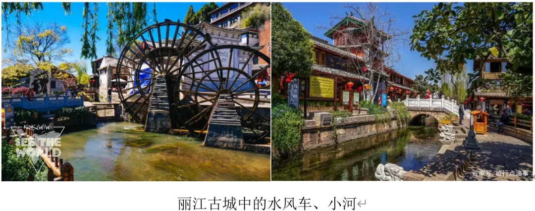 2. 水的内涵:水可以将时间感和空间感串联起来。正所谓“逝者如斯夫”,水不仅可以体现出流向和位置,也可以表现出时间的流逝。作者以水为叙述对象,既写出了岁月的流逝和变迁之感,也写出了丽江古城“依山而建”,奔流入江的地理构造。