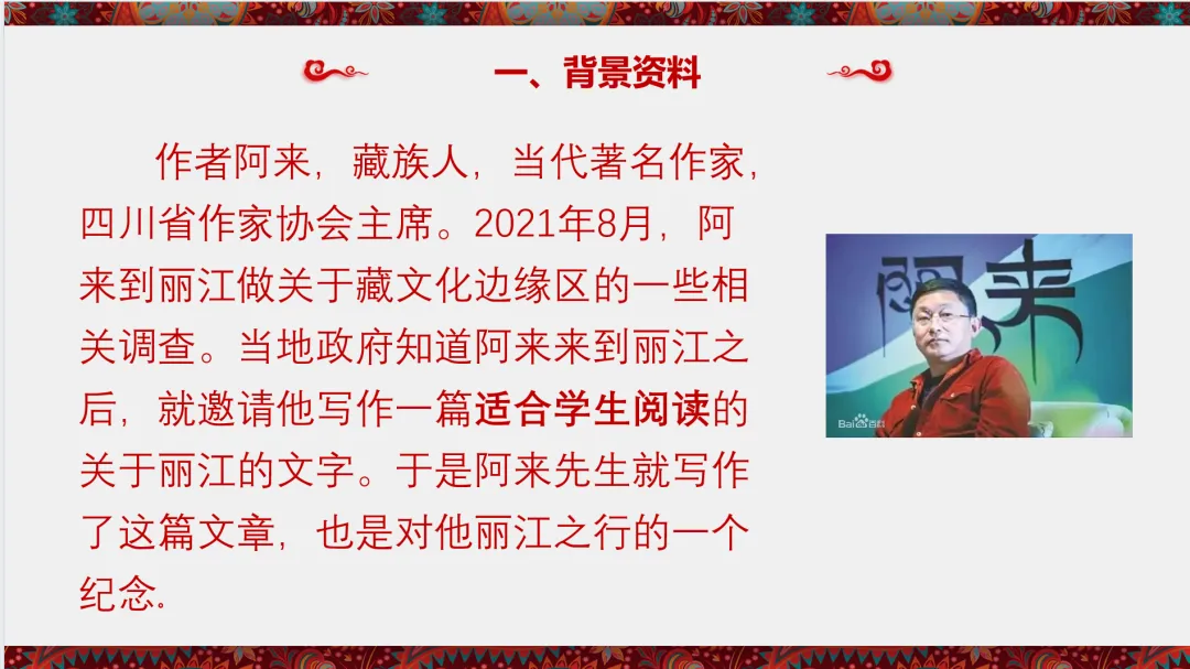 作者阿来,藏族人,当代著名作家,四川省作家协会主席。2021年8月,阿来到丽江做关于藏文化边缘区的一些相关调查。当地政府知道阿来来到丽江之后,就邀请他写作一篇适合学生阅读的关于丽江的文字。于是阿来先生就写作了这篇文章,也是对他丽江之行的一个纪念。